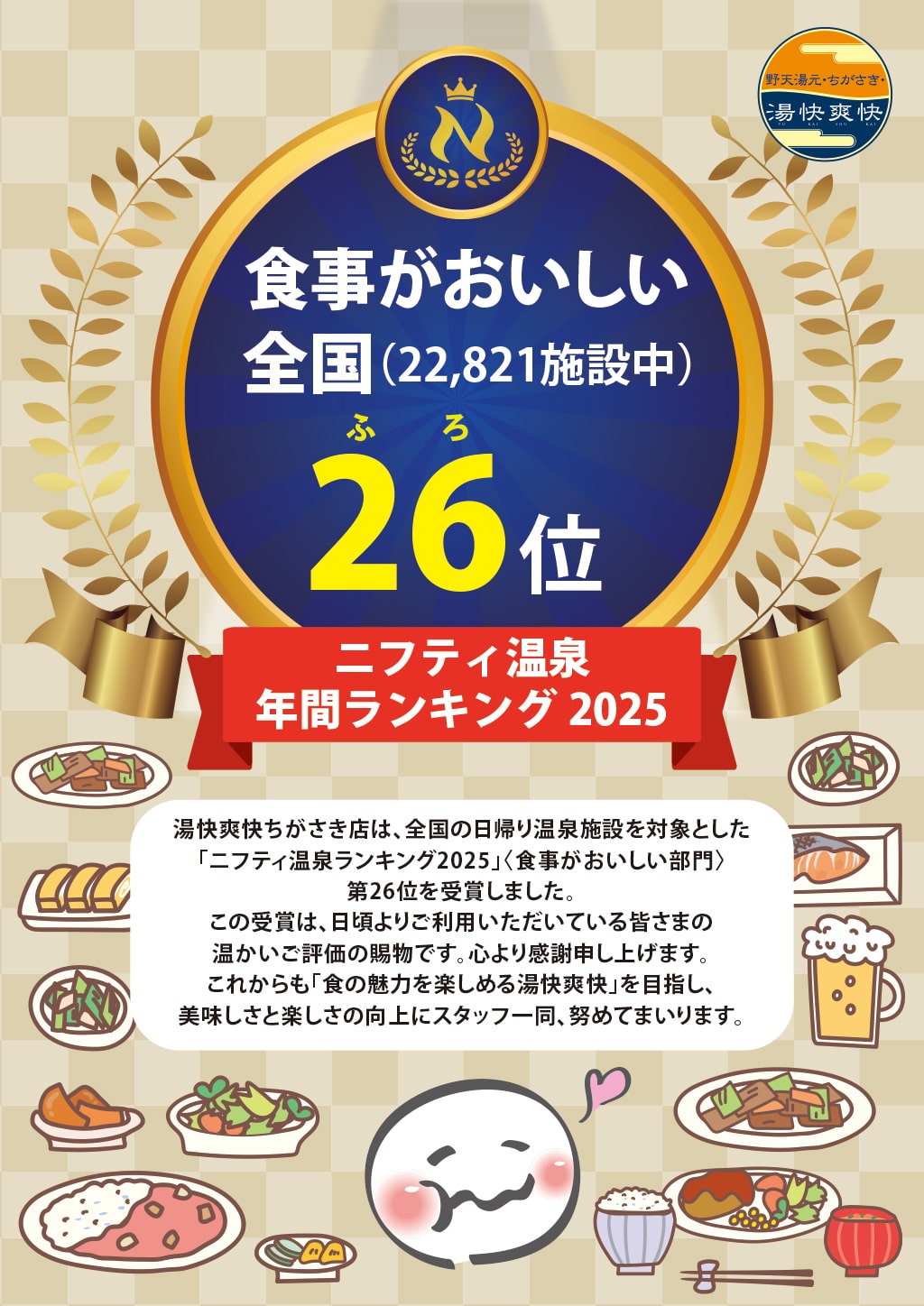 2025年12月18日 / 最終更新日時 : 2025年12月19日 takei NEWS & TOPICS ニフティ温泉 年間ランキング2025結果発表 「食事がおいしい」施設受賞のお知らせ この度、湘南茅ヶ崎温泉が、ニフティ温泉 年間ランキング2025にて部門別ランキングの「食事がおいしい」施設として、第26位での受賞となりましたことをご報告いたします。 全国約22,000施設の中から食事がおいしい部門 TOP30に選ばれました。 この受賞は、日頃よりご利用いただいている皆さまの温かいご評価の賜物です。心より感謝申し上げます。 これからも「食の魅力を楽しめる湯快爽快」を目指し、美味しさと楽しさの向上にスタッフ一同、努めてまいります。 野天湯元 湯快爽快ちがさき ニフティ温泉 年間ランキング2025 結果発表ページ 共有:Tweet
