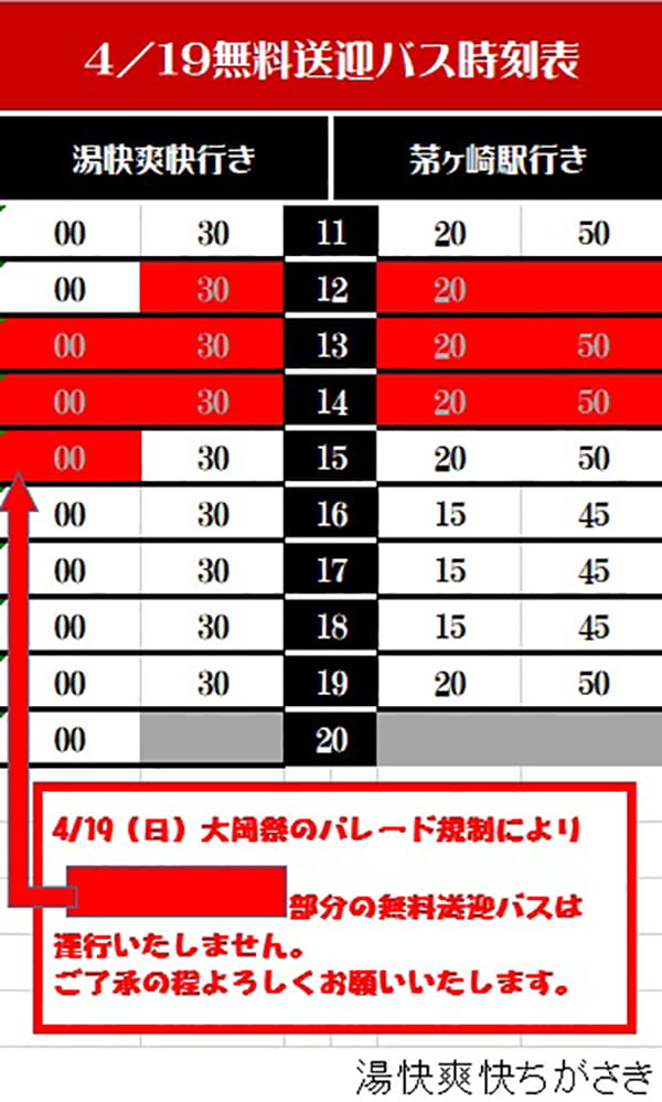 2026年4月19日(日)は、大岡祭パレード開催による通行規制に伴い、下記の時間帯は送迎バスを運休させていただきます。