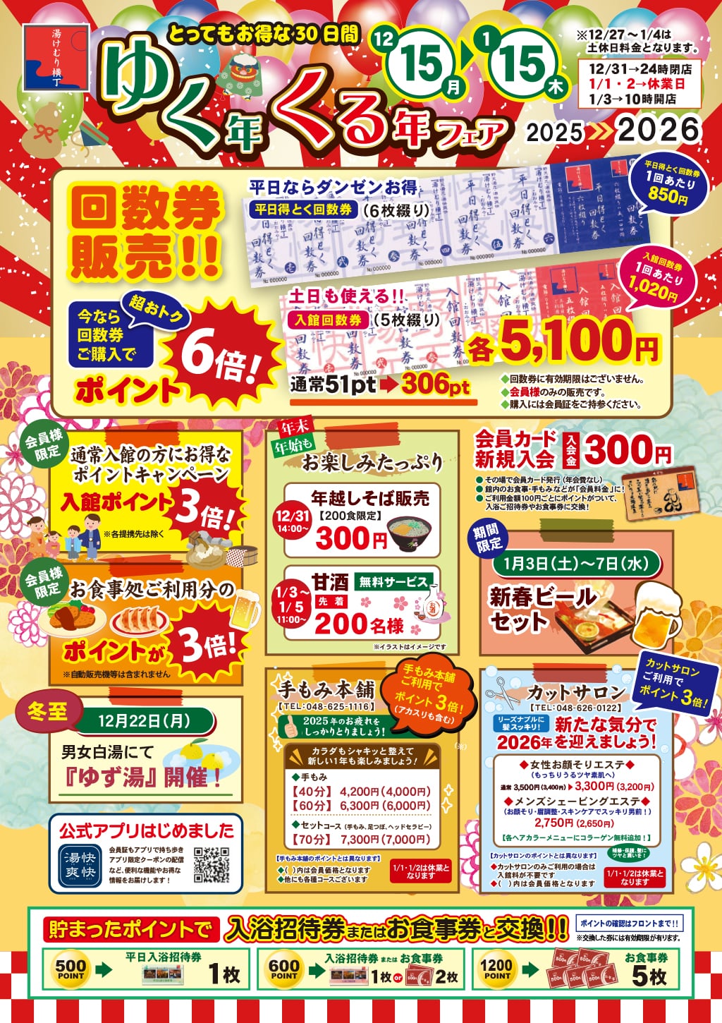 2025年12月15日 / 最終更新日時 : 2025年12月19日 dobashi NEWS & TOPICS ゆく年くる年フェア 2025⇒2026 年末年始のお出かけは、湯けむり横丁おおみや店へ! 楽しいイベントが満載💕 湯快爽快をまるごとお楽しみくださいね♨ 12/15(月)~1/15(木) 今年も一年間、湯快爽快 湯けむり横丁・おおみや・をご愛顧いただき誠にありがとうございました。 2025年、来る年も変わらずのご愛顧をよろしくお願いいたします。 みなさまの健康と長寿をお祈りします。 良いお年をお迎えくださいませ。 共有:Tweet