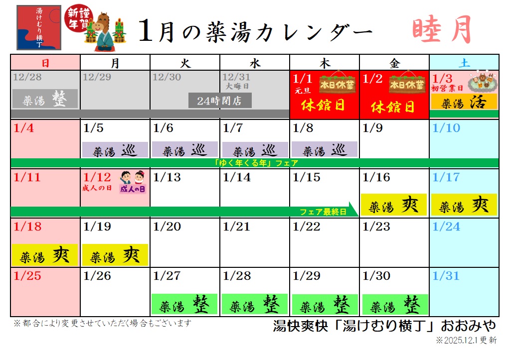 薬湯スケジュールは都合により変更させていただく場合がございます