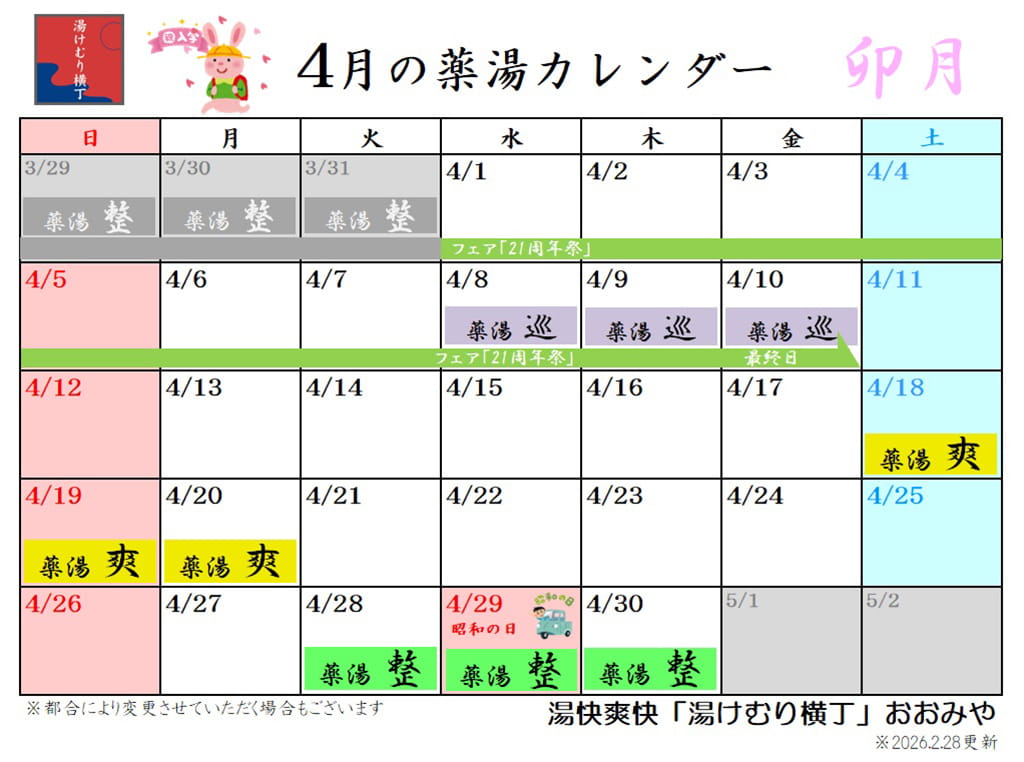 薬湯スケジュールは都合により変更させていただく場合がございます