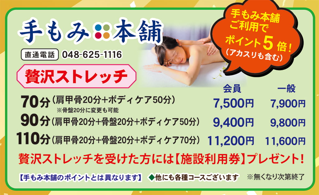 2026年3月5日 / 最終更新日時 : 2026年3月5日 takei リラクゼーション 手もみ本舗キャンペーン イベント詳細 日付: 2026年3月10 – 4月10日 カテゴリ: リラクゼーション 周年祭3/10(火)~4/10(金) 大感謝の21周年祭 手もみ本舗(アカスリ含む)のご利用でポイント5倍☆ しかも! 贅沢ストレッチを受けた方に・・・ 施設利用券をプレゼント 無くなり次第、終了となります 70分コース肩甲骨20分(又は、骨盤20分) + ボディケア50分 会員 7,500円/一般 7,900円(税込み) 90分コース肩甲骨20分 + 骨盤20分 + ボディケア50分 会員 9,400円/一般 9,800円(税込み) 110分コース肩甲骨20分 + 骨盤20分 + ボディケア70分 会員 11,200円/一般 11,600円(税込み) 他にも各種コースございます 貯まったポイントは入館招待券やお食事券に交換できます。 館内サービスをあれこれお得になる会員特典!ぜひご利用ください♨ 新規会員募集中 会員ポイント特典 500ptで平日入浴ご招待券 600ptで入浴ご招待券またはお食事券! 1,200pt貯まると・・・ ポイント特典を詳しく見る 手もみ本舗 お問合せ・ご予約はお気軽に TEL 048-625-1116 ・年中無休 [休館日を除く] ※予約優先 11:00 ~ 23:30(最終受付 23:00) 詳しくはコチラ