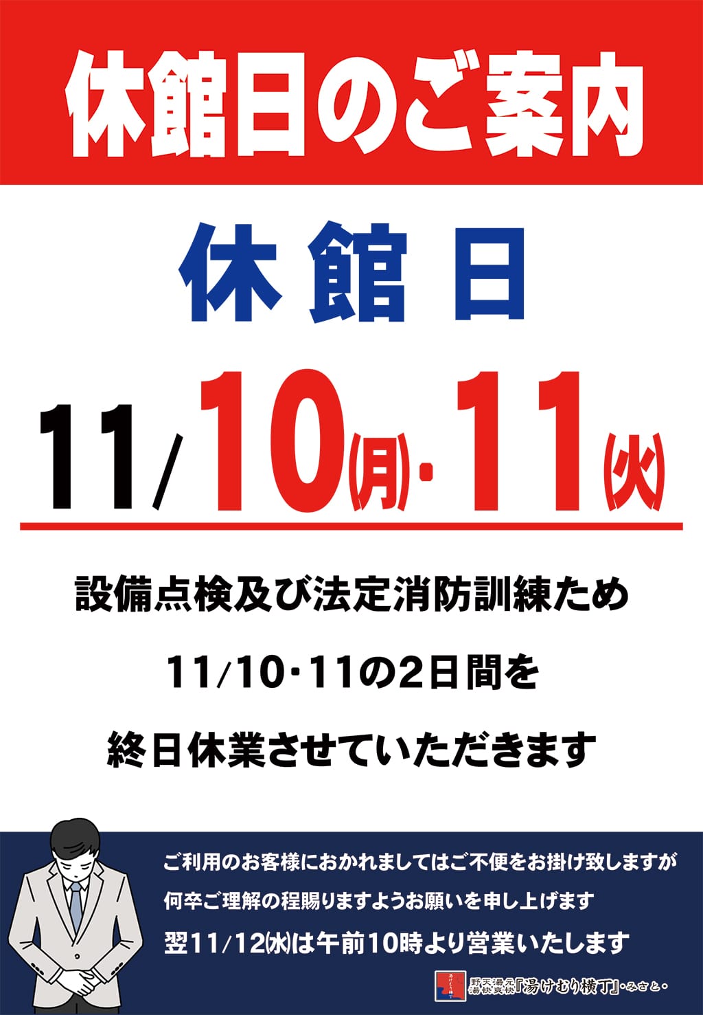 誠に勝手ながら、設備点検及び法定消防訓練のため、下記の2日間を終日休業とさせていただきます。