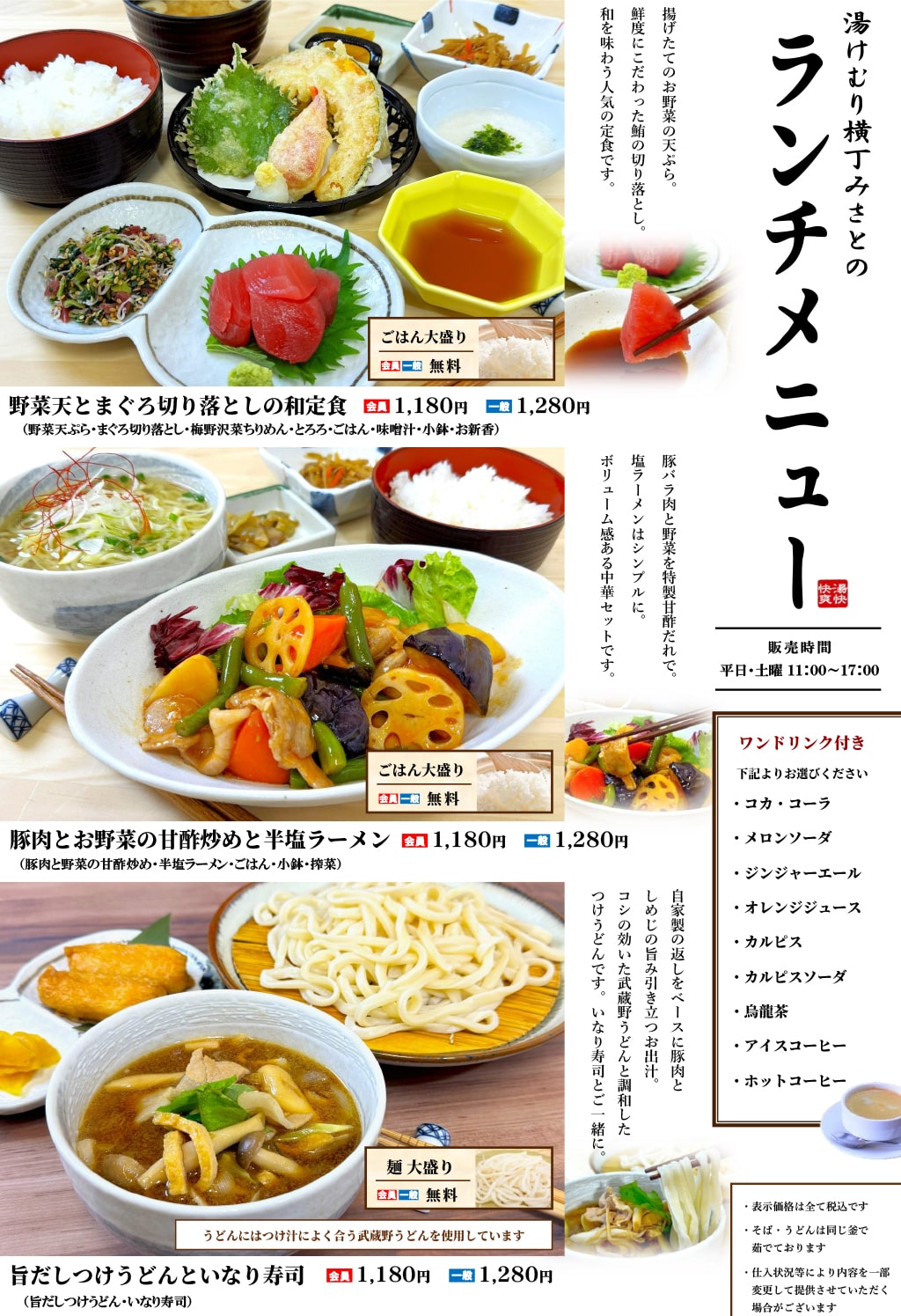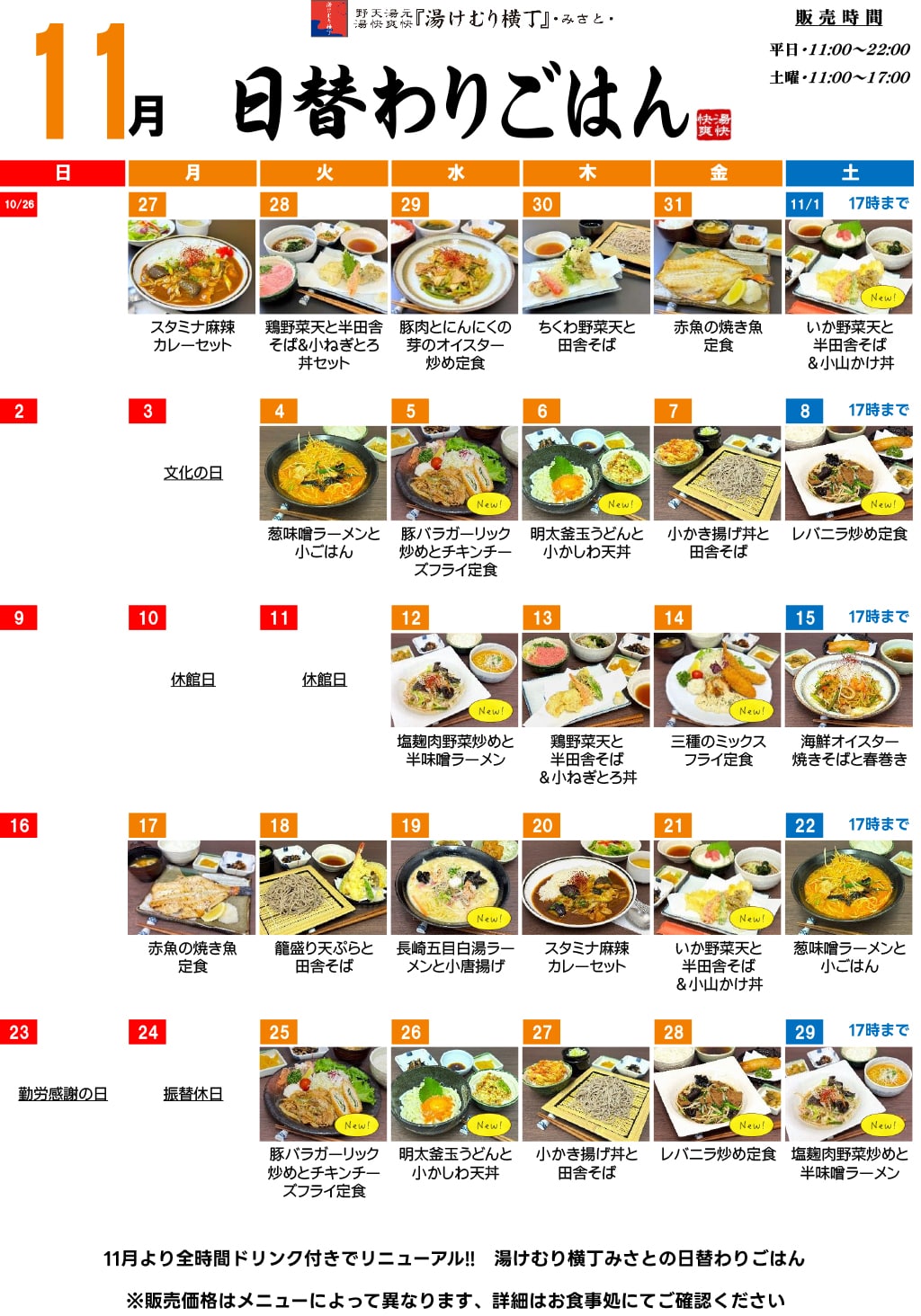 2025年11月1日 / 最終更新日時 : 2025年10月31日 dobashi NEWS & TOPICS 11月の『日替わりごはん』 ドリンクが付いてお得🎵 🍚月~土(祝祭日除く) 11:00~22:00(L.O.)の販売!📣土曜は17:00まで 😋 日替わりごはんはドリンク1杯無料サービス! Good Price!! 1,080円~1,280円(会員価格・税込) 日により内容が異なる場合があります。詳細はお食事処にて確認して下さい。 日替わりごはんの詳しいご案内 日替わりメニュー以外にもランチ限定メニューのご用意もございます☆ 🏡 お食事処のみのご利用入館OK ! 旬の食材を使ったメニューが充実!季節の味覚をどうぞ♪ お風呂に入らずにお食事だけでも、お気軽に湯快爽快みさと店をご利用ください。(1階のみのご利用となります) うれしい・美味しい期間限定メニューも開催!是非お見逃しなく~♪ 【営業時間】 11:00 ~ 23:00 (L.O. 22:00) お食事処のご案内はこちら 共有:Tweet