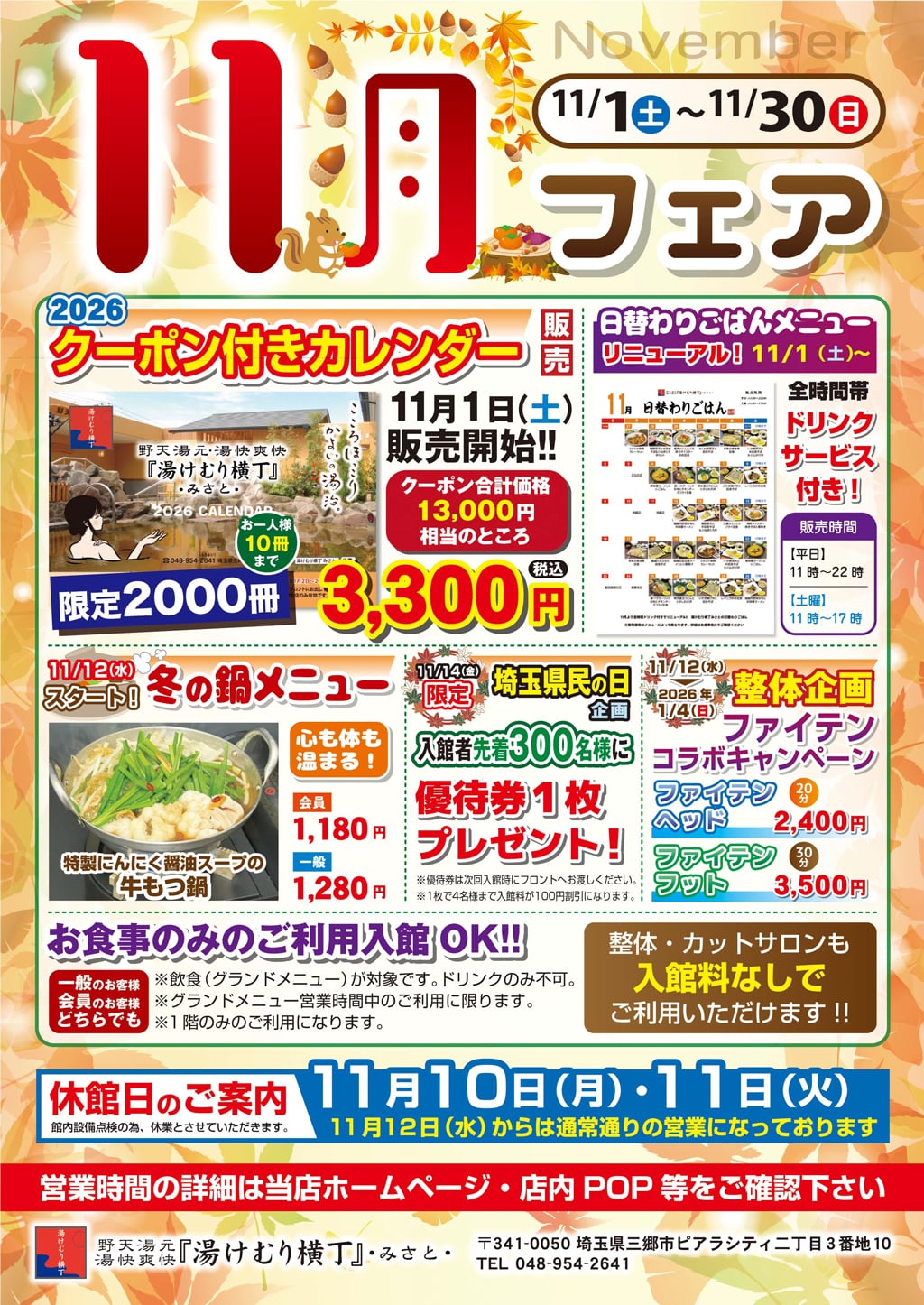 11/1(土)~11/30(日) 年末に向けて体調管理を万全に! 寒さが増してきたこの時期は三郷温泉でご湯っくりとお過ごしください♨ 皆様のお越しをお待ちしております🍄 お知らせ 誠に勝手ながら、11月10日(月)~11月11日(火)は設備点検のため休館いたします。 詳細はコチラ 🍂 ラインナップ 🍂 🎑️ クーポン付カレンダー限定販売 11/1(土)~無くなり次第終了 年間総額 約14,000円相当お得★ 入浴無料券や各種割引券などのクーポンがついた卓上カレンダー、今年も販売!お見逃しなく♨ 🎑️ 整体企画・ファイテンコラボ 11/12(水)~1/4(日) ファイテンとコラボした健康と癒しのキャンペーンをご案内します🎵気分スッキリ、リフレッシュしましょ! 🎑️ 埼玉県民の日企画 11/14(金) 埼玉県三郷市にある「湯けむり横丁みさと店」で一緒にお祝いしましょう♪ 入館いただいたお客様に「優待券」をプレゼントします🎁 🎑️ 日替わりごはん 食べてね\(◎o◎)/! お得で美味しいみさとのeveryday ソフトドリンク1杯サービス✨ ▪月~金(祝祭日除く)11:00~22:00(L.O.) ▪土曜 11:00~17:00 🎑️ お休み処&読書スペース どなたでもご利用いただける『無料スペース』です♪ ぜひご利用ください♥ ・店舗閉店時間の1時間前まで利用可能 ・約8,000冊のコミック&飲料の自動販売機を設置 🎑️ お食事処のみのご利用入館OK ! 旬の食材を使ったメニューが充実!季節の味覚をどうぞ♪ 期間限定メニュー好評販売中! お風呂に入らずにお食事だけでも、お気軽に湯快爽快みさと店をご利用ください。 1階のみのご利用となります 【営業時間】 11:00 ~ 23:00 (L.O. 22:00) お食事処のご案内はこちら 整体・カットサロンも入館料なしでご利用いただけます!