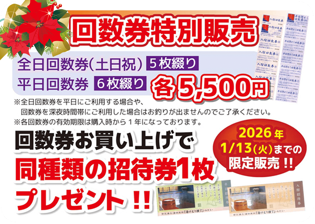 12/15(月)~1/13(火) 年末年始はお得ゲット✨ 《 期間限定 》招待券をプレゼント✨ 1回あたりの入浴料が💕お得💕になる回数券でたっぷりお楽しみ下さいね。 平日得とく回数券(6枚綴り) ≪ オススメ! 5,500円 ➡ 1回あたりの入館料 916円 入館回数券(5枚綴り) ≪ 土日も使える 5,500円 ➡ 1回あたりの入館料 1,100円 さらに 嬉しい特典が! 《今だけ✨》 回数券をご購入いただくと・・・ 同種類の『入館招待券』を1枚プレゼント🎁いたします🎵 是非この機会に! ご注意 回数券の販売は会員様限定です ご購入には会員証をご持参ください 回数券の有効期間は1年間です