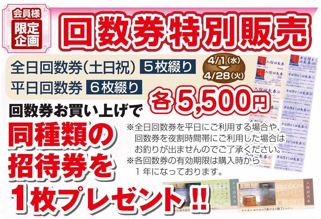 4/1(水)~4/28(火) 4月です🌸新年度の始まりは『癒し時間をお得に』ゲット✨ 《 期間限定 》招待券をプレゼント✨ 1回あたりの入浴料が💕お得💕になる回数券でたっぷりお楽しみ下さいね。 平日得とく回数券(6枚綴り) ≪ オススメ! 5,500円 ➡ 1回あたりの入館料 916円 入館回数券(5枚綴り) ≪ 土日も使える 5,500円 ➡ 1回あたりの入館料 1,100円 さらに 嬉しい特典が! 《今だけ✨》 回数券をご購入いただくと・・・同種類の『入館招待券』を1枚プレゼント🎁いたします🎵 是非この機会に! ご注意 回数券の販売は会員様限定です ご購入には会員証をご持参ください 回数券の有効期間は1年間です