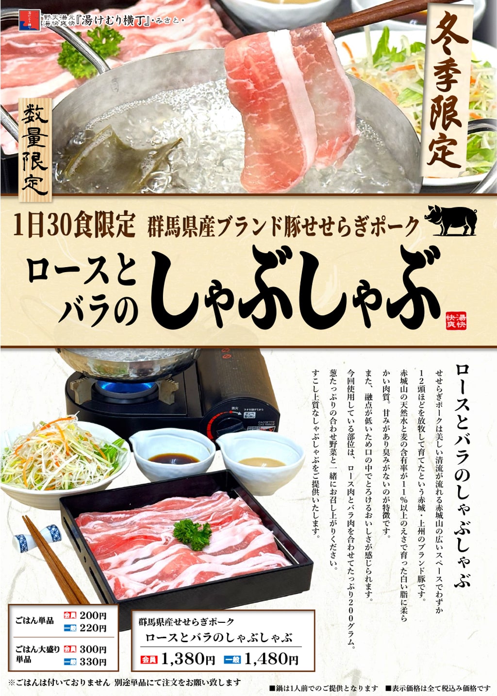 Home 期間限定メニュー 【冬季限定】せせらぎポークのしゃぶしゃぶ 【冬季限定】せせらぎポークのしゃぶしゃぶ 2025.12.2 期間限定メニュー 12/2~ 1日30食限定✨ 冬場はほっこり⛄温泉もお食事も地元の湯けむり横丁で♨ 群馬県産ブランド豚『せせらぎポーク』の少し上質なロースとバラを、たっぷりとしゃぶしゃぶでお召し上がりください。 ~ お品書き ~ ⛄ロースとバラのしゃぶしゃぶ 口の中でとろけるおいしさ💛 会員 1,380円 / 一般 1,480円 ⛄ごはん単品 ごはんは別注文です 会員 200円 / 一般 220円 大盛り 会員 300円 / 一般 330円 Post