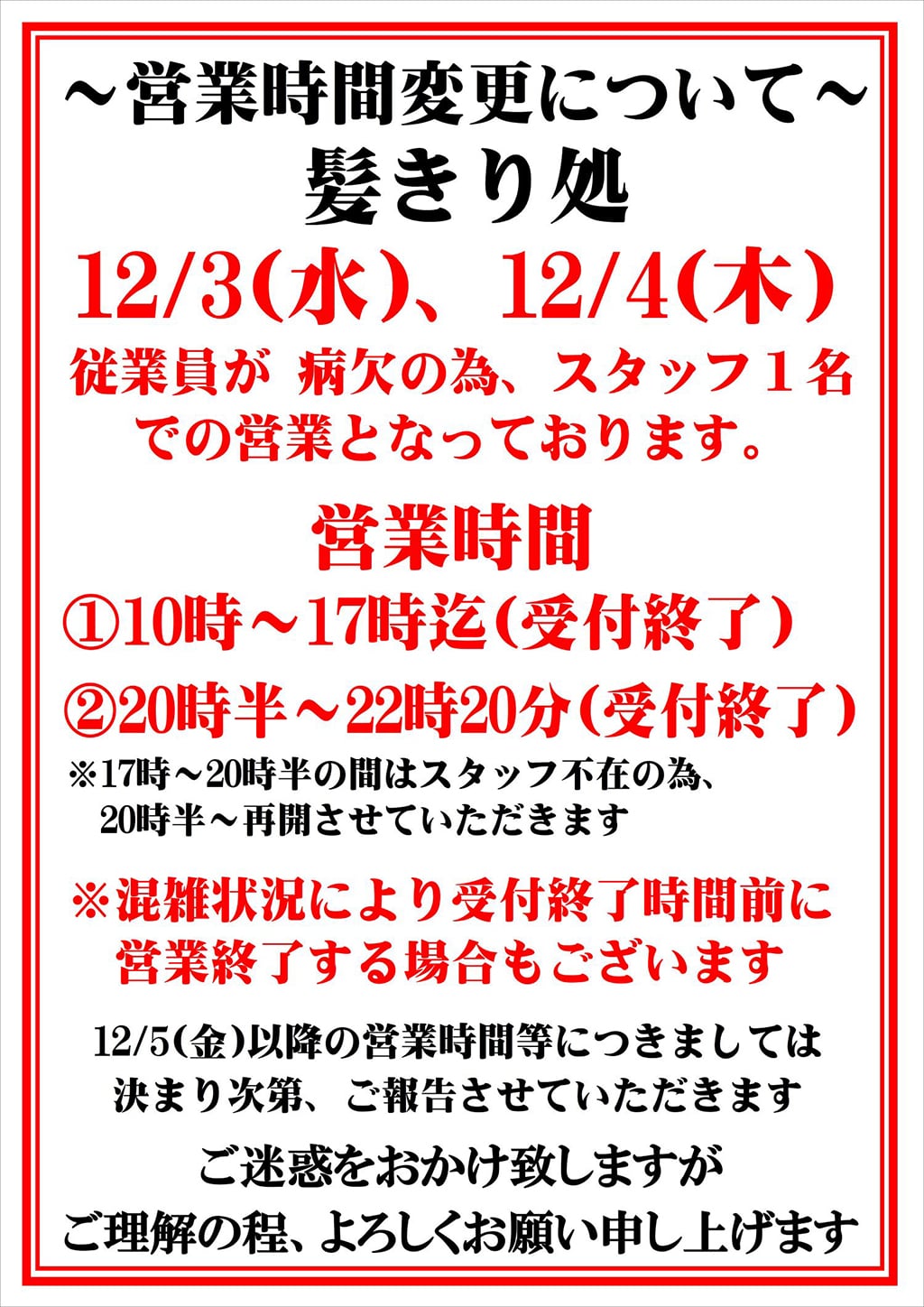お客様各位 日頃より 野天湯元 湯快爽快たや をご利用くださいまして、誠にありがとうございます。 誠に勝手ながら、令和7年12月3日(水)、4日(木)は、スタッフ病欠による人員不足のためスタッフ一名での営業となります。 お客様には、大変ご不便、ご迷惑をおかけいたしますが、何卒ご理解くださいますようお願い申し上げます。 湯快爽快たや髪切り処店主 敬白