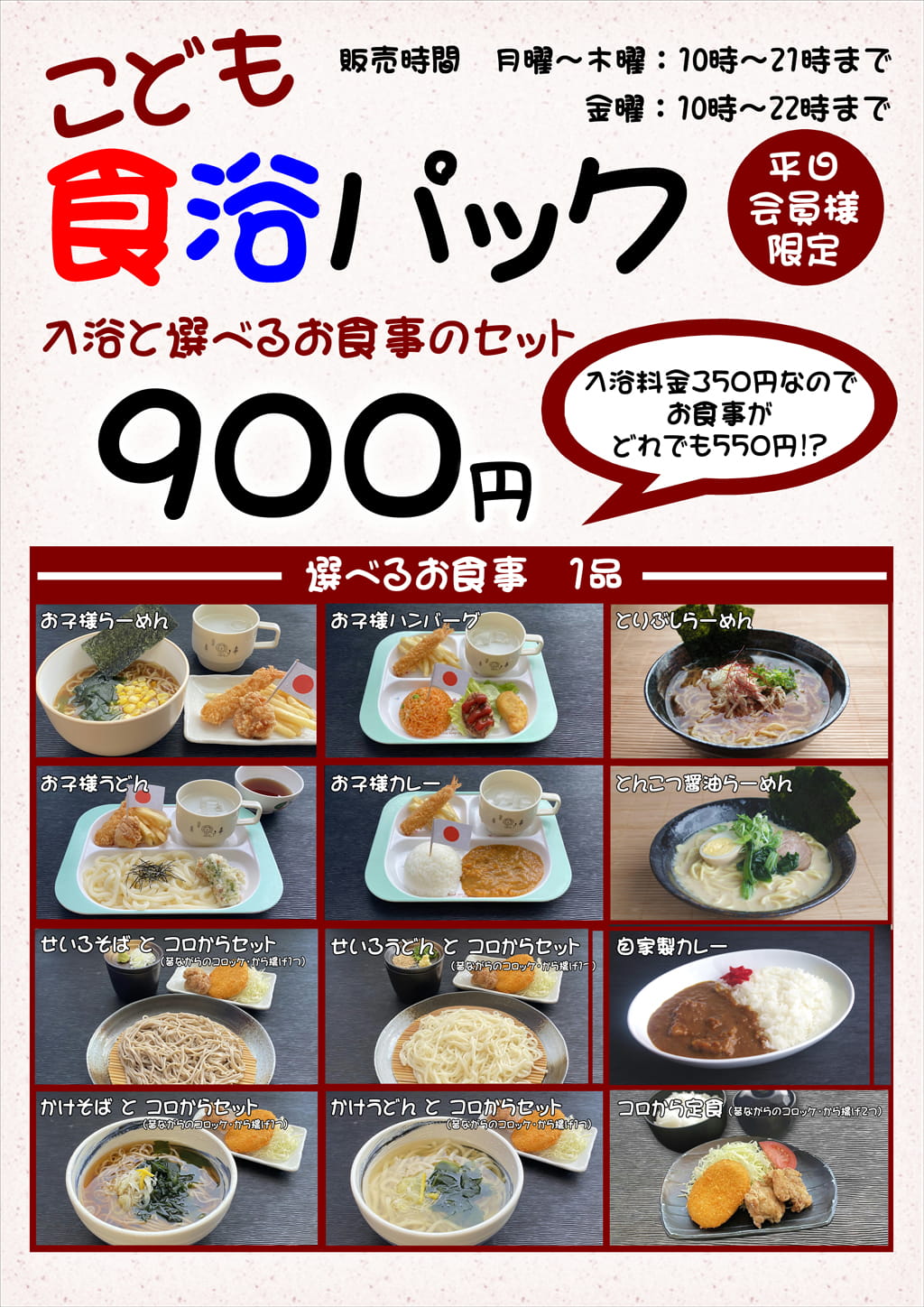 会員様平日のみ限定企画 【販売時間】 ・月~木 / 10:00~21:00 ・金 / 10:00~22:00 選べるお食事と1日入浴券がセットでおトク! さらに月曜日ならお楽しみデザート付き!! 食浴パック 1,700円 お食事するなら絶対にお得! 1日使える入浴券とお好きにお選びいただける御食事券をセットにして、会員様なら平日1,700円! こども食浴パック 900円 お子様だってゆっくり田谷温泉を楽しみたい! 入浴・食事のセットが平日限定900円。心も体もお得にほっこり!