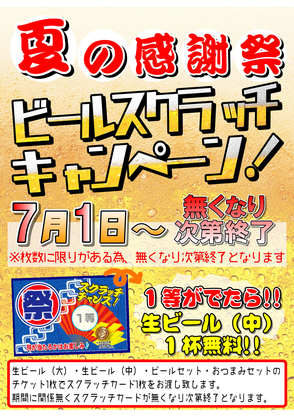 2016年7月1日 / 最終更新日時 : 2016年7月6日 このイベントは終了しました ビールスクラッチ イベント詳細 日付: 2016年7月1 – 31日 カテゴリ: このイベントは終了しました 夏の感謝祭 ビールスクラッチキャンペーン! 7/1(金)~ 感謝祭記念!なくなり次第終了! お食事処で 生ビール(大) 生ビール(中) ビールセット おつまみセット をご注文のお客様に、スクラッチカードを1枚プレゼント。 何が当たるかは、削ってのお楽しみ! 共有:Tweet