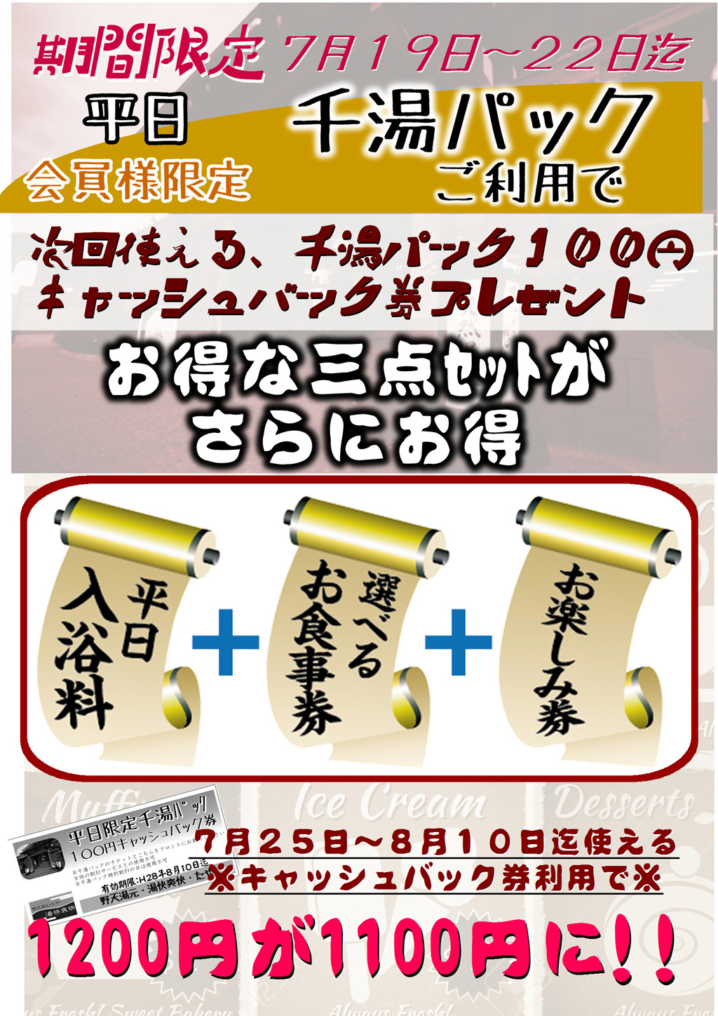 2016年7月2日 / 最終更新日時 : 2016年7月2日 このイベントは終了しました 千湯パックがお得 イベント詳細 日付: 2016年7月19 – 22日 カテゴリ: このイベントは終了しました 千湯パック キャッシュバック券プレゼント 7/19(火)~7/22(金) お得な3点セットがさらにお得! 期間中に千湯パックをご利用いただくと、次回使える千湯パック100円キャッシュバック券をプレゼント! キャッシュバック券のご利用で、7/25~8/10の千湯パックが 1,200円 → 1,100円に! 共有:Tweet