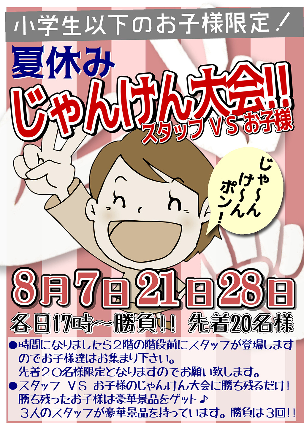 2016年7月28日 / 最終更新日時 : 2016年7月29日 okubo このイベントは終了しました 子どもじゃんけん イベント詳細 このイベントは28 8月 2016に終了しました カテゴリ: このイベントは終了しました 夏休みじゃんけん大会! 8/7・21・28(日) 17時~ 数量限定、なくなり次第終了! 夏休み、日曜の夕方はスタッフとじゃんけんで勝負! 各日17時から先着20名のお子様と、2階の階段前でスタッフがじゃんけん勝負。 見事勝ち残ったお子様には豪華景品をプレゼント!勝負は3回。豪華景品目指してFight!! 共有:Tweet