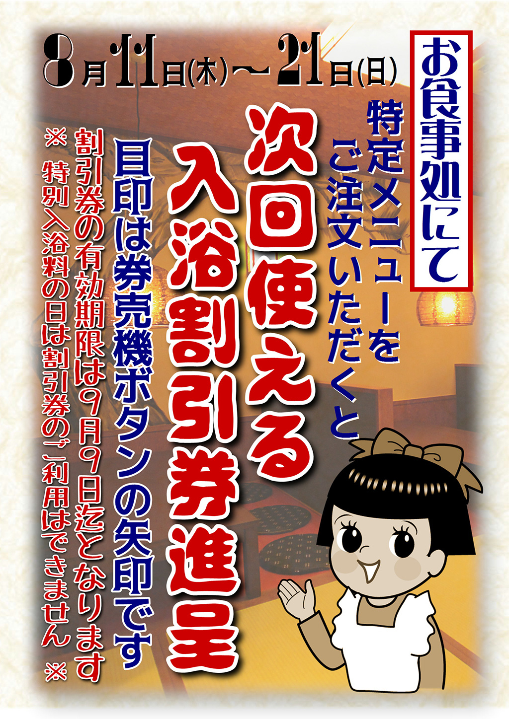 2016年7月29日 / 最終更新日時 : 2016年7月29日 このイベントは終了しました 入浴割引券進呈 イベント詳細 日付: 2016年8月11 – 21日 カテゴリ: このイベントは終了しました 次回使える入浴割引券プレゼント 8/11(木)~8/21(日) お食事処で特定メニューを注文してGET! 期間中、湯快爽快たやのお食事処をご利用のお客様で、店舗指定の特定メニューをご注文いただいたお客様に、次回使える「入浴割引券」をプレゼントいたします。 湯上りに美味しい至福のひとときを、「次も嬉しい」特別なひとときに。 ※割引券の有効期限は2016年9月9日(金)です ※特別入浴料の日は割引券がご利用いただけません 共有:Tweet