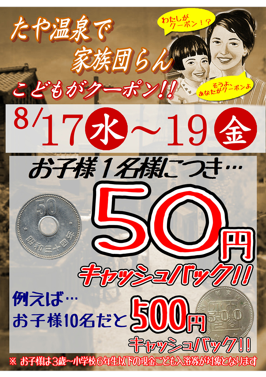 2016年7月29日 / 最終更新日時 : 2016年7月29日 このイベントは終了しました 家族団らん イベント詳細 日付: 2016年8月17 – 19日 カテゴリ: このイベントは終了しました 田谷温泉で家族団欒 8/17(水)~8/19(金) お子様がクーポンです。 家族みんなでゆっくり過ごしてほしいから・・・ 湯快爽快たやでは、期間中お子様連れのお客様に嬉しい「家族団欒」キャンペーンを開催いたします。 ご入浴のお子様1名様につき50円をキャッシュバック。 夏休みは家族みんなで湯快爽快!共有:Tweet