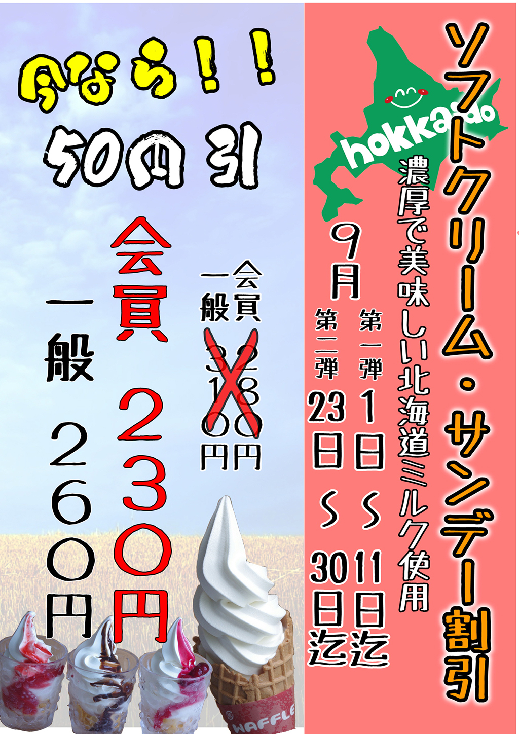 2016年8月29日 / 最終更新日時 : 2016年10月3日 okubo このイベントは終了しました サンデー・ソフト割 イベント詳細 このイベントは30 9月 2016に終了しました カテゴリ: このイベントは終了しました ソフトクリーム or サンデー割 9/1(木)~9/11(日), 9/23(金)~9/30(金) 暑い夏にひとときの清涼を! 濃厚で美味しい北海道ミルクをふんだんに使用した、湯快爽快たやお食事処のソフトクリームや各種サンデーを、期間中は50円引きでご提供。 ヒンヤリおいしいお得な夏をぜひお楽しみください。 ソフトクリーム or サンデー各種 会員 280円 / 一般 310円 → 会員 230円 / 一般 260円 共有:Tweet