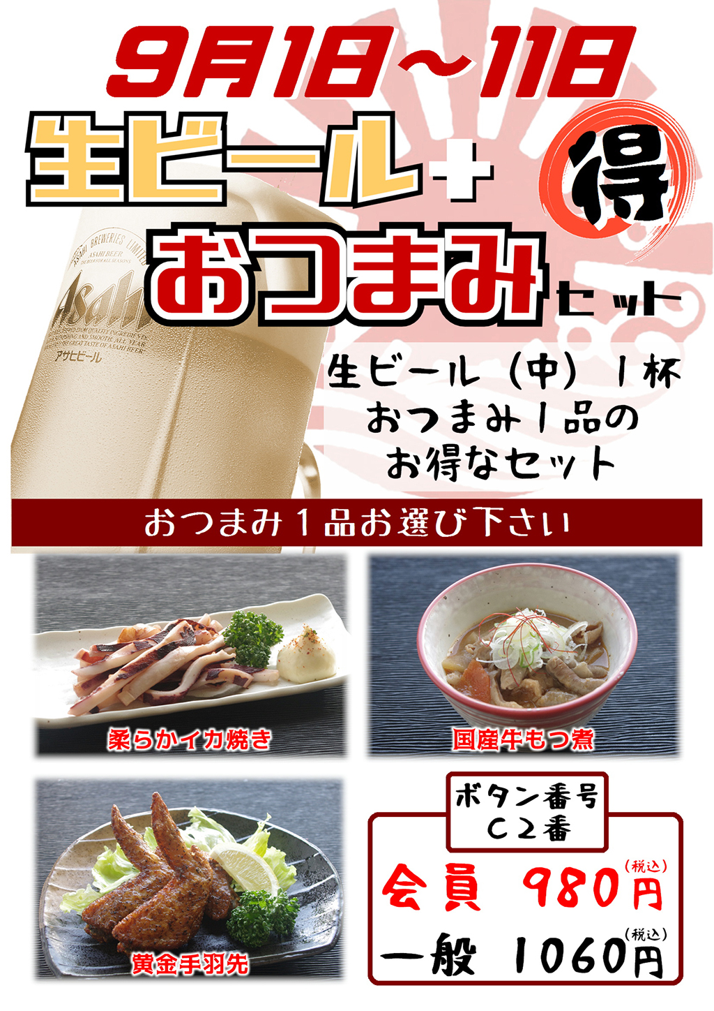 2016年8月29日 / 最終更新日時 : 2016年8月29日 okubo このイベントは終了しました 生ビおつまみセット イベント詳細 日付: 2016年9月1 – 11日 カテゴリ: このイベントは終了しました 生ビール+おつまみ 得々セット 9/1(木)~9/11(日) 田谷温泉の黒湯や医療用炭酸泉で疲れをいやした後は、風呂上がりに格別の1杯を。 湯快爽快たやのお食事処では、期間限定で生ビールによく合うおつまみのお得なセットをご提供。 この機会にぜひ、湯快爽快で「乾杯!」を。 選べるおつまみ 柔らかイカ焼き 国産牛もつ煮 黄金手羽先 生ビール(中)とセットで 会員 980円 / 一般 1,060円 共有:Tweet