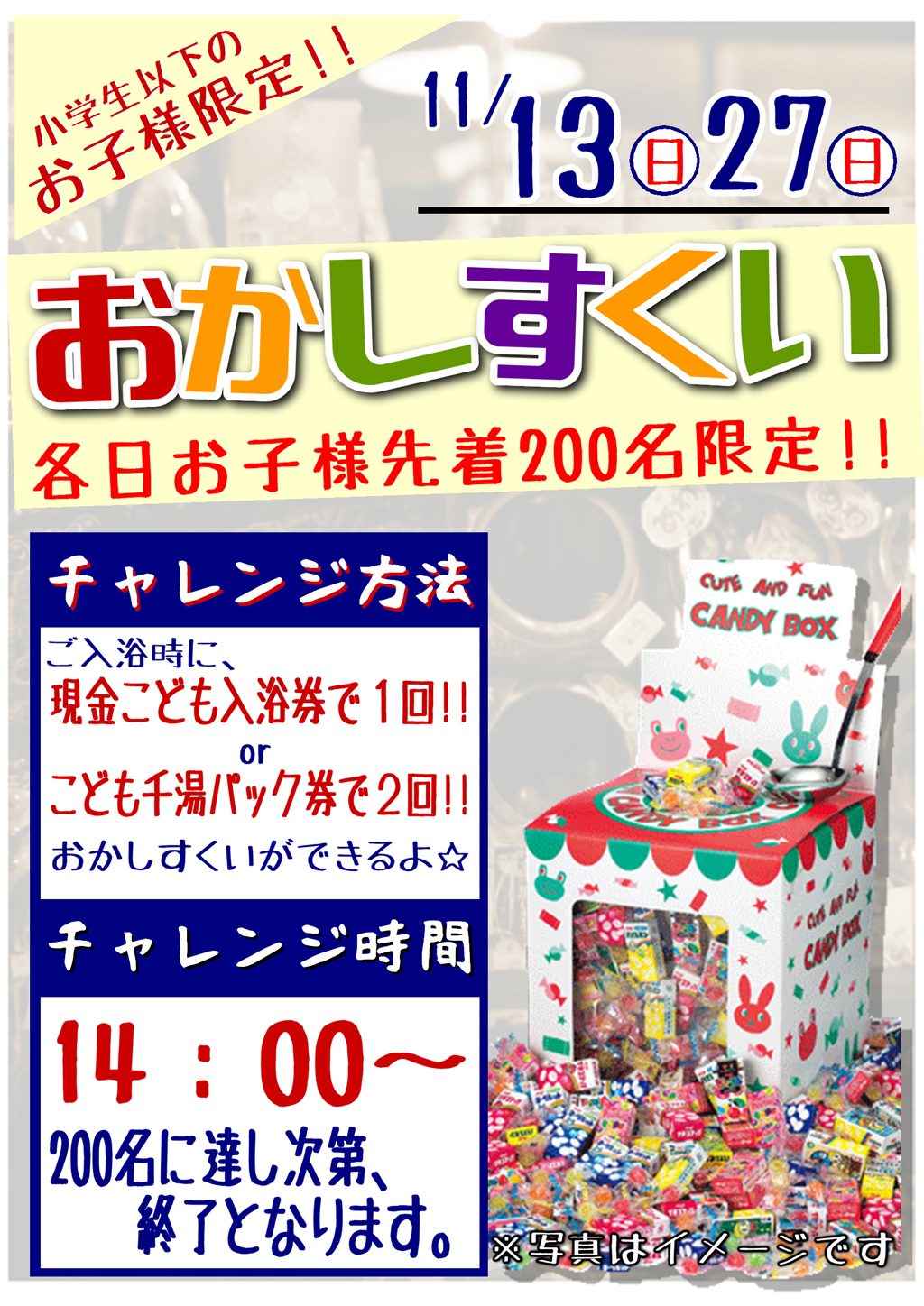 2016年10月31日 / 最終更新日時 : 2016年10月31日 okubo このイベントは終了しました おかしすくい イベント詳細 このイベントは27 11月 2016に終了しました カテゴリ: このイベントは終了しました おかしすくい 11/13(日)・27(日) 各日14時から先着200名様限定! 11月の第2・4日曜日は、お風呂に入ってお菓子をGET! 14時から小学生以下のお子様を対象に、「おかしすくい」を開催します。 チャレンジはご入浴の受付のとき。 現金入浴券なら1回 こども千湯パックなら2回 おかしすくいに挑戦できます。 14時からの早い者勝ち、ぜひお楽しみに! 共有:Tweet
