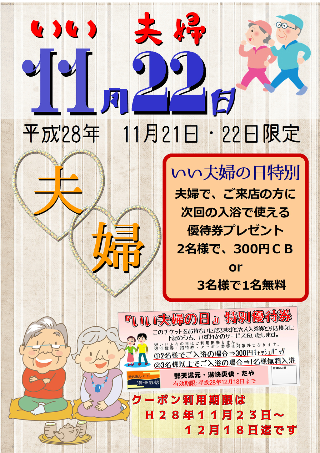 2016年10月31日 / 最終更新日時 : 2016年10月31日 okubo このイベントは終了しました いい夫婦の日 イベント詳細 日付: 2016年11月21 – 22日 カテゴリ: このイベントは終了しました いい夫婦の日特別優待 11/21(月)・22(火) 11月22日は「良い夫婦の日」。 湯快爽快たやからも、そんな素敵なご夫婦に特別なプレゼントをご用意。期間中ご夫婦でご来店のお客様に、次回使える特別優待券を差し上げます。 こちらのご優待券を次回お持ちいただくと・・・ ご夫婦でご来店・・・300円キャッシュバック ご家族やご友人と一緒に3名様以上でご来店・・・1名様ご入浴無料 の素敵な特典が受けられます。 まずは「良い夫婦の日」にご入浴で、優待券をGET! 共有:Tweet