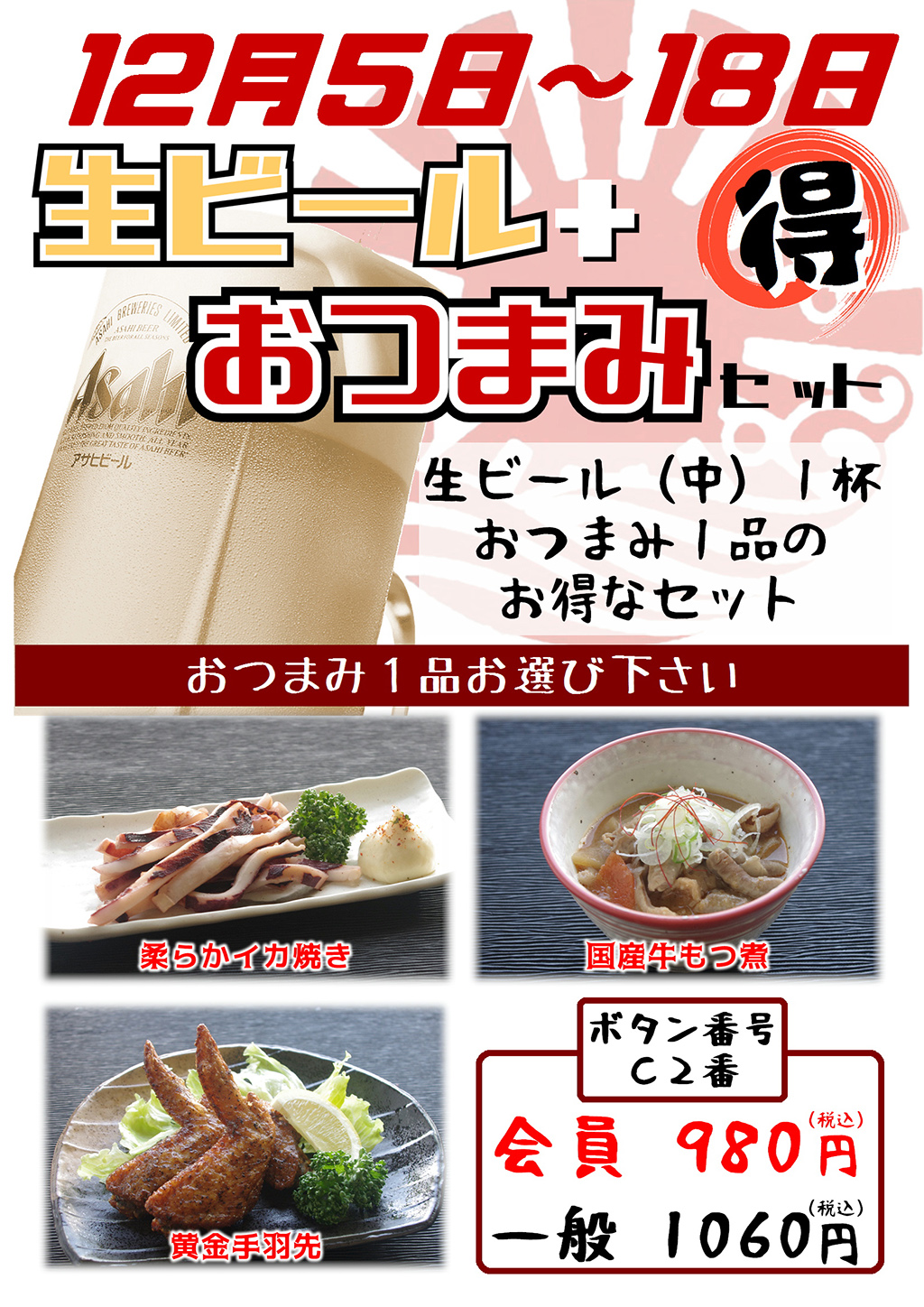 2016年11月29日 / 最終更新日時 : 2016年11月29日 okubo このイベントは終了しました 生ビおつまみセット イベント詳細 日付: 2016年12月5 – 18日 カテゴリ: このイベントは終了しました 生ビール+おつまみ 得々セット 12/5(月)~12/18(日) 田谷温泉の黒湯や医療用炭酸泉で疲れをいやした後は、風呂上がりに格別の1杯を。 湯快爽快たやのお食事処では、期間限定で生ビールによく合うおつまみのお得なセットをご提供。 この機会にぜひ、湯快爽快で「乾杯!」を。 選べるおつまみ 柔らかイカ焼き 国産牛もつ煮 黄金手羽先 生ビール(中)とセットで 会員 980円 / 一般 1,060円 共有:Tweet