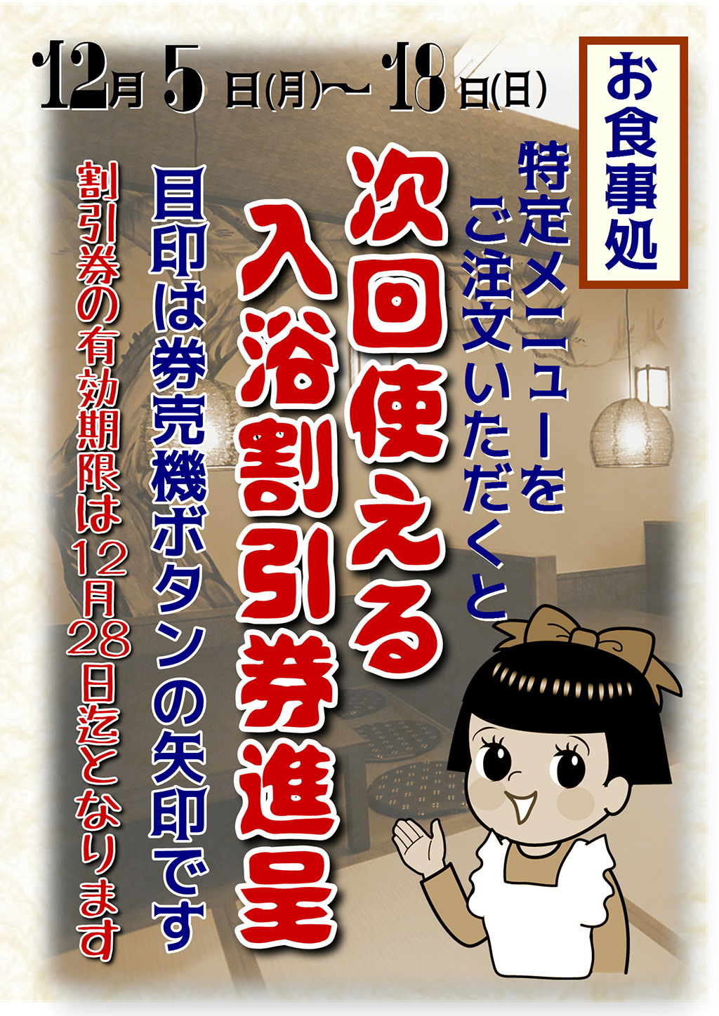 2016年11月29日 / 最終更新日時 : 2016年11月29日 okubo このイベントは終了しました 入浴割引券進呈 イベント詳細 日付: 2016年12月5 – 18日 カテゴリ: このイベントは終了しました 次回使える入浴割引券プレゼント 12/5(月)~12/18(日) お食事処で特定メニューを注文してGET! 期間中、湯快爽快たやのお食事処をご利用のお客様で、店舗指定の特定メニューをご注文いただいたお客様に、次回使える「入浴割引券」をプレゼントいたします。 湯上りに美味しい至福のひとときを、「次も嬉しい」特別なひとときに。 ※割引券の有効期限は2016年12月28日(水)です ※特別入浴料の日は割引券がご利用いただけません 共有:Tweet