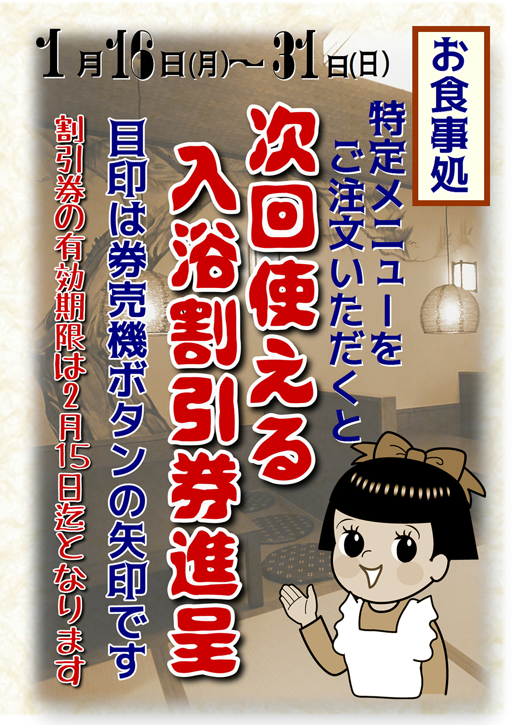 2016年12月28日 / 最終更新日時 : 2016年12月28日 okubo このイベントは終了しました 入浴割引券進呈 イベント詳細 日付: 2017年1月16 – 31日 カテゴリ: このイベントは終了しました 次回使える入浴割引券プレゼント 1/16(月)~1/31(日) お食事処で特定メニューを注文してGET! 期間中、湯快爽快たやのお食事処をご利用のお客様で、店舗指定の特定メニューをご注文いただいたお客様に、次回使える「入浴割引券」をプレゼントいたします。 湯上りに美味しい至福のひとときを、「次も嬉しい」特別なひとときに。 ※割引券の有効期限は2017年2月15日(水)です ※特別入浴料の日は割引券がご利用いただけません 共有:Tweet