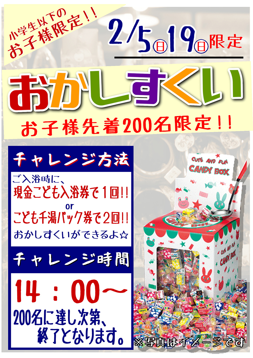 2017年1月27日 / 最終更新日時 : 2017年1月30日 okubo このイベントは終了しました おかしすくい イベント詳細 このイベントは19 2月 2017に終了しました カテゴリ: このイベントは終了しました おかしすくい 2/5(日)・19(日) 14時から先着200名のお子様限定! 2月の第1・3日曜日は、お風呂に入ってお菓子をGET! 14時から小学生以下のお子様を対象に、「おかしすくい」を開催します。 チャレンジはご入浴の受付のとき。 現金入浴券なら1回 こども千湯パックなら2回 おかしすくいに挑戦できます。 14時からの早い者勝ち、ぜひお楽しみに! 共有:Tweet