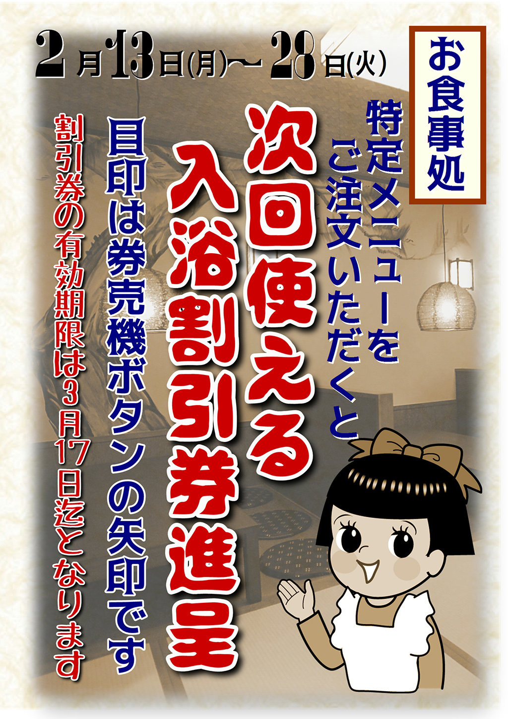 2017年1月27日 / 最終更新日時 : 2017年1月27日 okubo このイベントは終了しました 入浴割引券進呈 イベント詳細 日付: 2017年2月13 – 28日 カテゴリ: このイベントは終了しました 次回使える入浴割引券プレゼント 2/13(月)~2/28(火) お食事処で特定メニューを注文してGET! 期間中、湯快爽快たやのお食事処をご利用のお客様で、店舗指定の特定メニューをご注文いただいたお客様に、次回使える「入浴割引券」をプレゼントいたします。 湯上りに美味しい至福のひとときを、「次も嬉しい」特別なひとときに。 ※割引券の有効期限は2017年3月17日(金)です ※特別入浴料の日は割引券がご利用いただけません 共有:Tweet