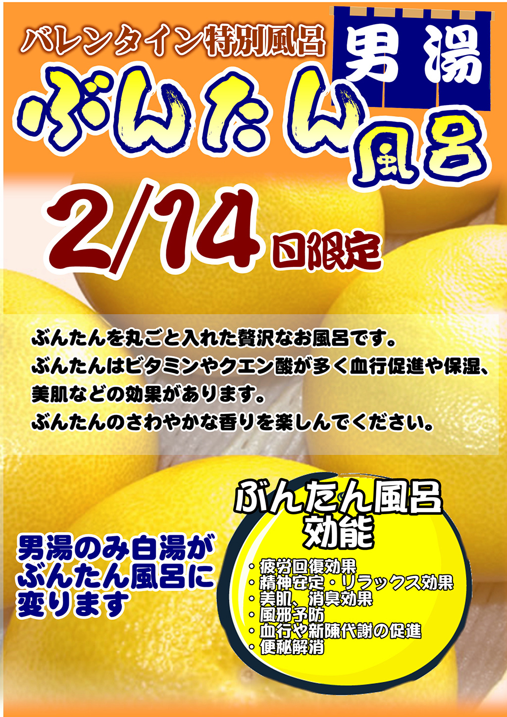 2017年1月27日 / 最終更新日時 : 2017年1月27日 okubo このイベントは終了しました ぶんたん風呂 イベント詳細 日付: 2017年2月14日 カテゴリ: このイベントは終了しました 男性限定 ぶんたん風呂 2/14(火) ぶんたんを丸ごと入れた贅沢なお風呂です。 ぶんたんはビタミンやクエン酸が多く血行促進や保湿、美肌などの効果があります。 バレンタイン当日、男湯のみの限定開催。 ぶんたんのさわやかな香りを楽しんでください。 ~効能~ 疲労回復効果・精神安定・リラックス効果・美肌・消臭効果・風邪予防・血行や新陳代謝の促進・便秘解消 共有:Tweet