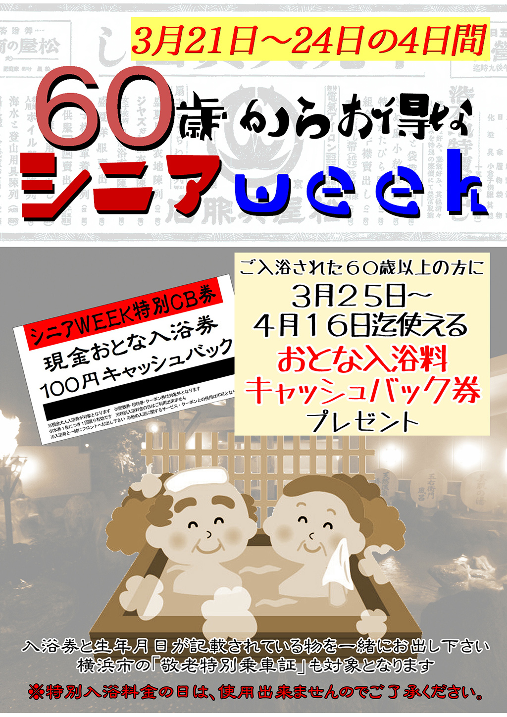 期間中ご入浴の60歳以上のお客様で、入浴券と一緒に年齢を示すものをご提示いただいたお客様に、3/25(土)から使える「入浴料キャッシュバック券」を差し上げます。