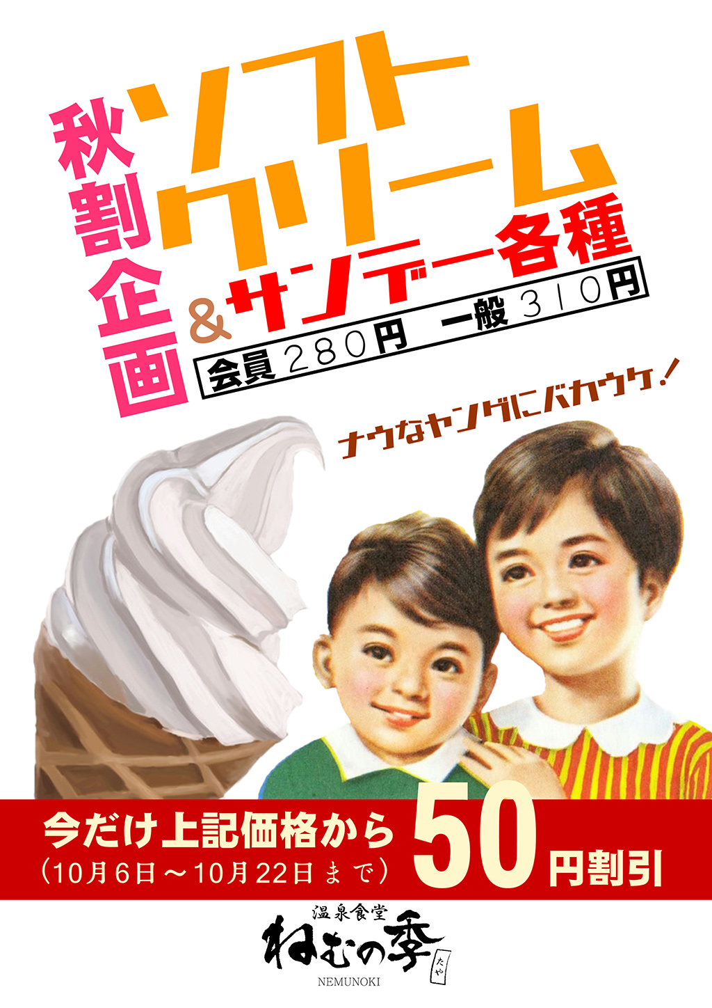 2017年9月27日 / 最終更新日時 : 2017年9月27日 okubo このイベントは終了しました サンデー・ソフト割 イベント詳細 日付: 2017年10月6 – 22日 カテゴリ: このイベントは終了しました ソフトクリーム or サンデー割 10/6(金) ~ 10/22(日) 湯上りの火照った身体にひとときの清涼を! 濃厚で美味しい北海道ミルクをふんだんに使用した、湯快爽快たやお食事処のソフトクリームや各種サンデーを、期間中は50円引きでご提供。 ヒンヤリおいしい!をお得にお楽しみください。 ソフトクリーム or サンデー各種 会員 280円 / 一般 310円 → 会員 230円 / 一般 260円 共有:Tweet