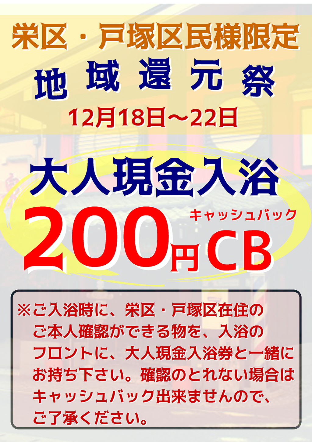 2017年11月30日 / 最終更新日時 : 2017年11月30日 okubo このイベントは終了しました 地域還元祭 イベント詳細 日付: 2017年12月18 – 22日 カテゴリ: このイベントは終了しました 地域還元祭 12/18(月)~22(金) 横浜市栄区・戸塚区民様限定 クリスマス直前の平日は、地域の皆様にどどん!と還元祭! 期間中ご来店で、大人現金入浴券をお求めの「横浜市栄区」・「横浜市戸塚区」にお住まいの方に、もれなく200円をキャッシュバック! ご入浴時に栄区または戸塚区にお住まいであることが証明できるご本人様確認書類をフロントまでお持ちください。 ※確認が取れない場合はキャッシュバック対象外となります 共有:Tweet
