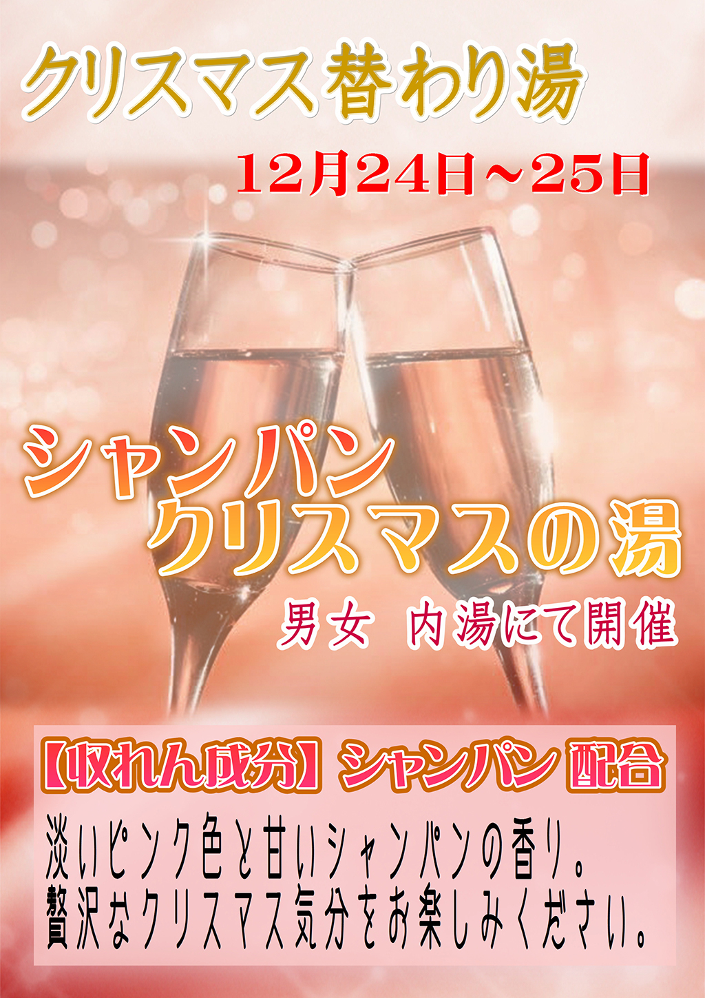 2017年11月30日 / 最終更新日時 : 2017年11月30日 okubo このイベントは終了しました 特別替わり湯 イベント詳細 このイベントは24 12月 2017に終了しました カテゴリ: このイベントは終了しました クリスマス限定特別替わり湯「シャンパンクリスマスの湯」 12/24(日)~12/25(月) クリスマス限定開催 湯快爽快たや、クリスマスは男女とも白湯にて特別な替り湯を開催。 淡いピンクと甘いシャンパンの香り。 贅沢なクリスマス気分をお楽しみください。 共有:Tweet
