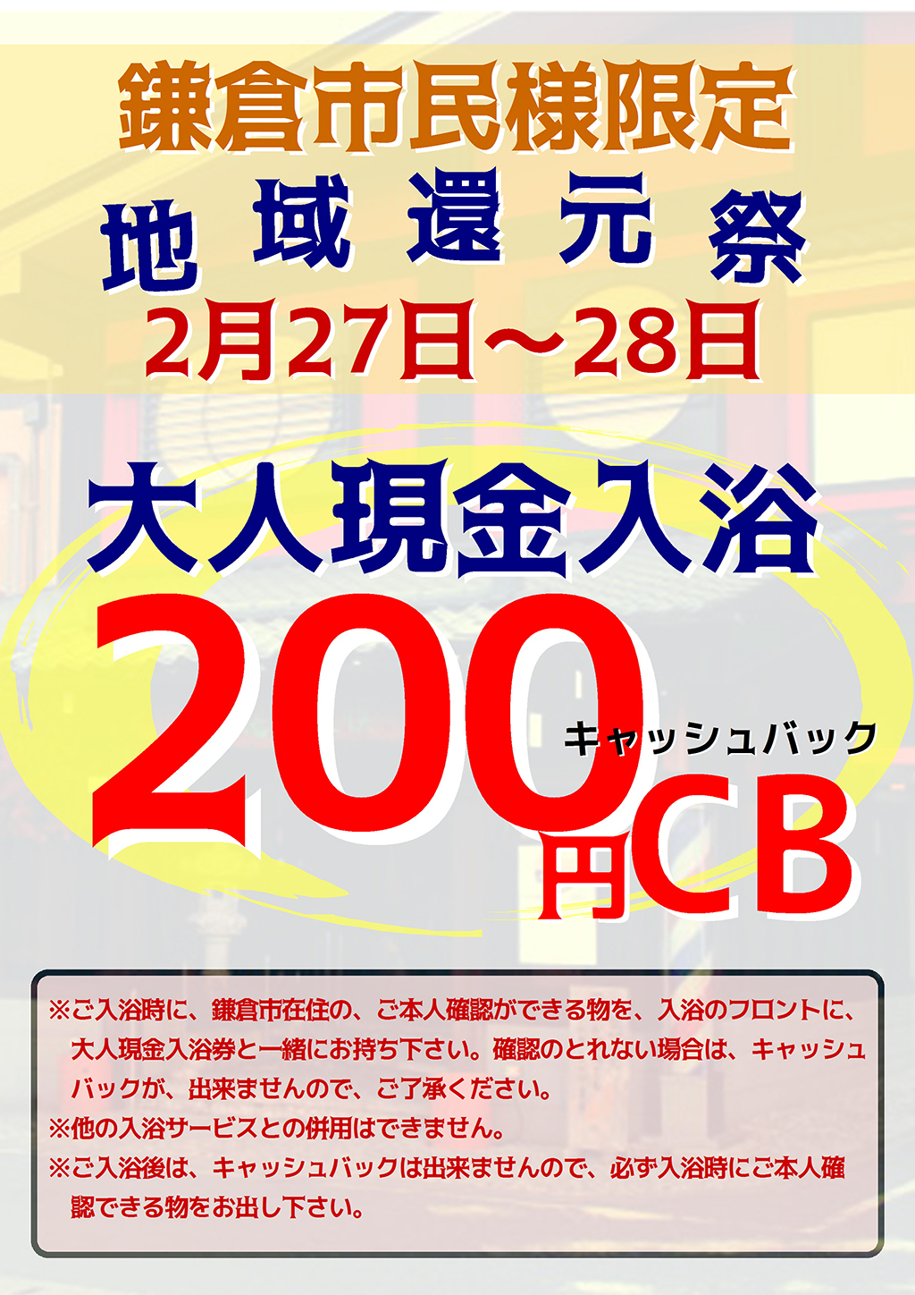 2018年1月29日 / 最終更新日時 : 2018年1月29日 okubo このイベントは終了しました 地域還元祭(鎌倉市民対象) イベント詳細 日付: 2018年2月27 – 28日 カテゴリ: このイベントは終了しました 地域還元祭 2/27(火)~28(水) 鎌倉市民様限定 2月の最後は田谷温泉でお得にゆっくりほっこりと♪ 期間中ご来店で、大人現金入浴券をお求めの「鎌倉市」にお住まいの方に、もれなく200円をキャッシュバック! ご入浴時に「鎌倉市」にお住まいであることが証明できるご本人様確認書類をフロントまでお持ちください。 ※確認が取れない場合はキャッシュバック対象外となります 共有:Tweet