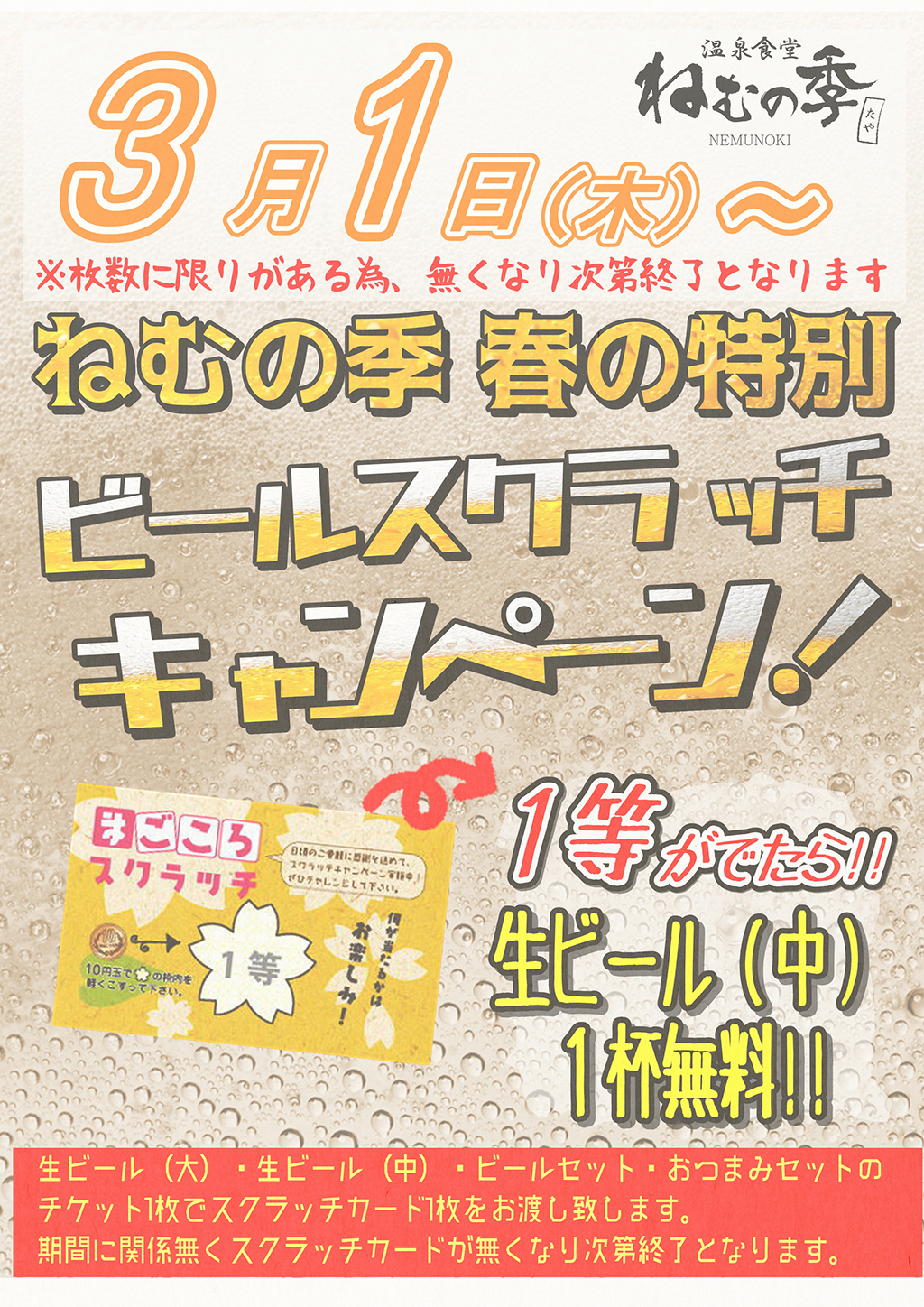 2018年2月28日 / 最終更新日時 : 2018年2月28日 okubo このイベントは終了しました ビールスクラッチ イベント詳細 日付: 2018年3月1 – 31日 カテゴリ: このイベントは終了しました ビールスクラッチキャンペーン 3/1(木)~ 数量限定、なくなり次第終了! 期間中、生ビール(大・中)やビールセット、おつまみセットをご注文ごとにスクラッチカードを1枚差し上げます。 何が出るかは削ってからのお楽しみ。 1等が出れば、生ビール(中)1杯無料サービス! 共有:Tweet