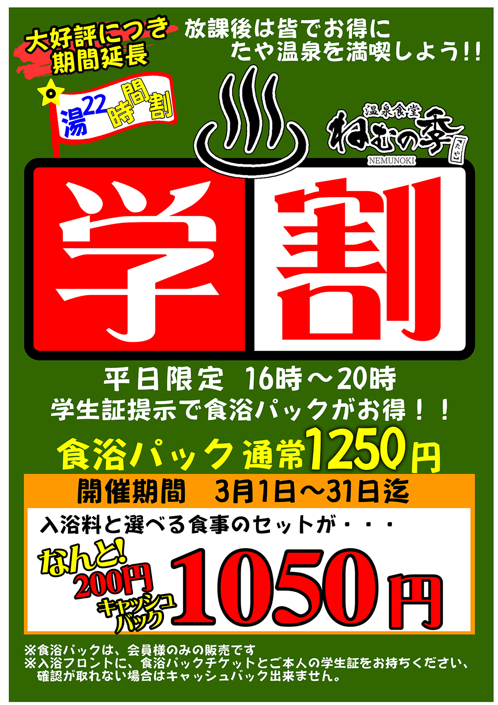 2018年2月28日 / 最終更新日時 : 2018年2月28日 okubo このイベントは終了しました 学割タイムセール イベント詳細 このイベントは30 3月 2018に終了しました カテゴリ: このイベントは終了しました 食欲パック学割タイムセール3/1(木)~3/31(土) 平日限定 16時~20時 放課後は田谷温泉でしっかり食って、ゆっくり温まって・・・ 湯快爽快たやでは期間中、平日の16時~20時限定で「学割」をご用意。食事と風呂がセットでお得な「食浴パック」が、学生証のご提示でさらに200円のキャッシュバック! 学校帰りはみんなでワイワイ湯快爽快たやへGO! ※食欲パックは会員様のみの販売です※お食事処の座席を長時間占有することはお断りいたします 共有:Tweet