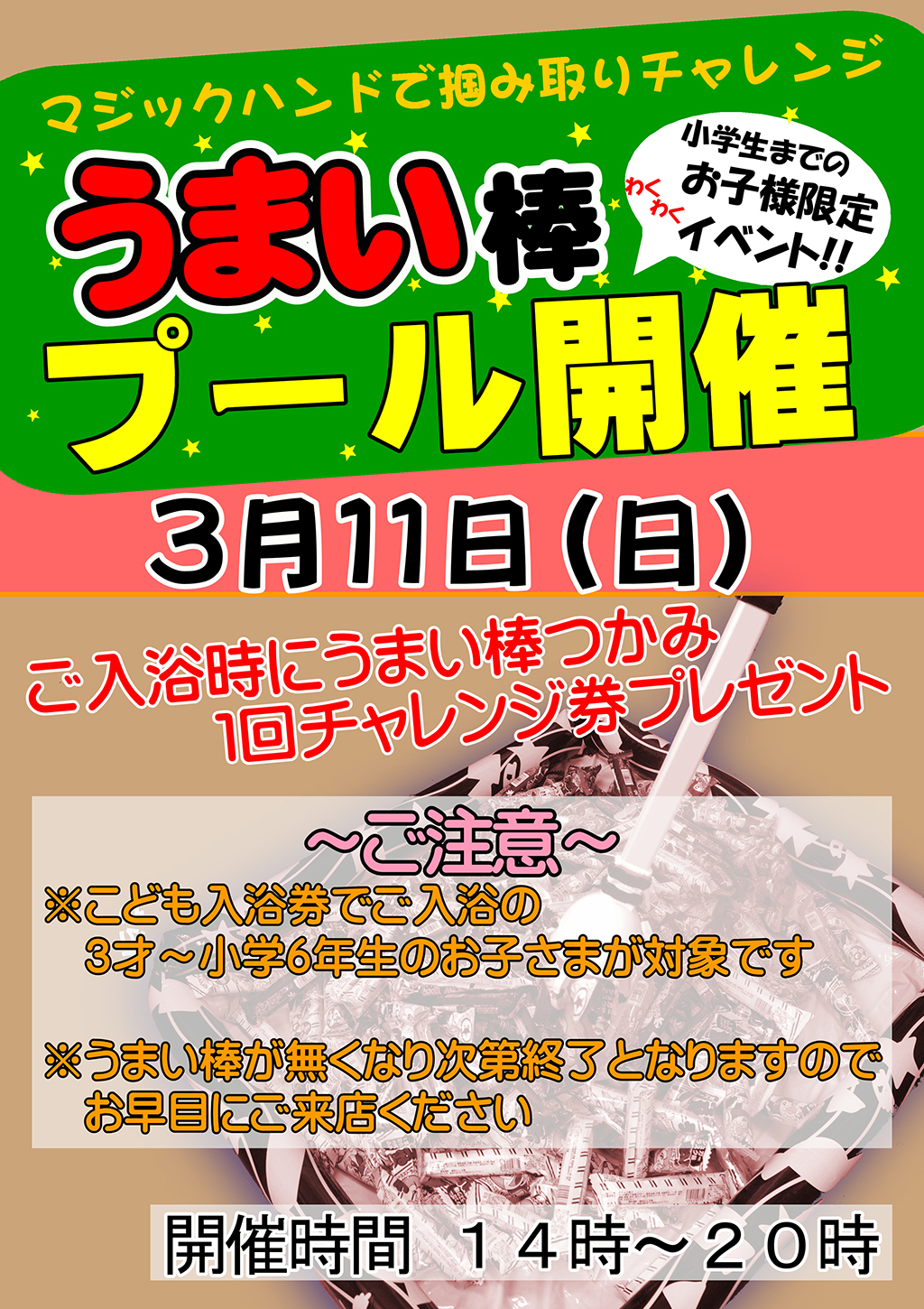 2018年3月6日 / 最終更新日時 : 2018年3月6日 okubo このイベントは終了しました うまい棒プール イベント詳細 日付: 2018年3月11日 カテゴリ: このイベントは終了しました うまい棒プール 3/11(日) 14時~20時 小学生までのお子様限定。 3/11の14時~20時にご入浴のお子様に、うまい棒つかみ1回無料券をプレゼント。 マジックハンドで「うまい棒プール」の中からたくさんのうまい棒をGETしよう! さらに、こども千湯パックを含めお食事処で「お子様ランチ」をご注文いただいたお子様にはもう1枚プレゼント! お風呂に入って、ランチを食べて、大好きなおやつを思う存分もらっちゃおう! 共有:Tweet
