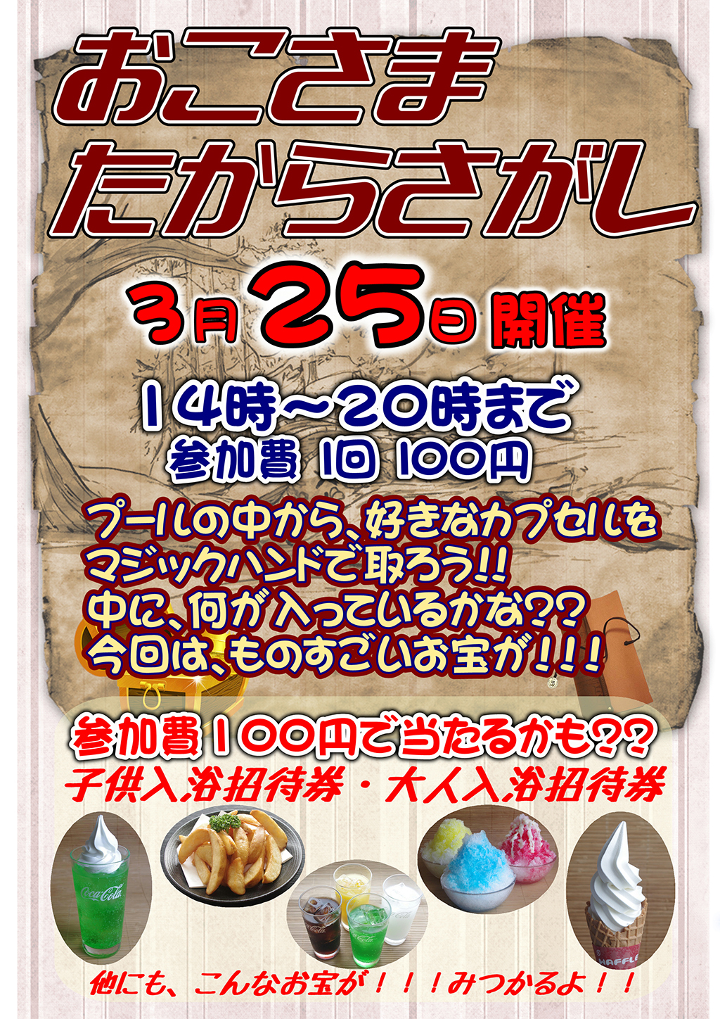 2018年3月6日 / 最終更新日時 : 2018年3月6日 okubo このイベントは終了しました たからさがし イベント詳細 このイベントは25 3月 2018に終了しました カテゴリ: このイベントは終了しました おこさまたからさがし 3/25(日) 14時から20時まで、お子様限定! 8/27の午後は、家族みんなで田谷温泉にいらっしゃい! お子様限定、1回100円で参加できる楽しいつかみ取り。 大当たりなら「こども入浴招待券」や当店の「大人入浴招待券」が当たる。 他にもソフトドリンクやお食事処のおやつなど、嬉しいお宝がいっぱい! 共有:Tweet