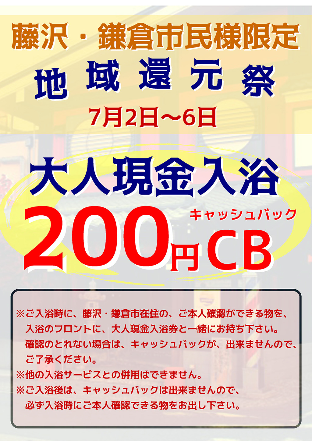 2018年6月29日 / 最終更新日時 : 2018年6月29日 okubo このイベントは終了しました 地域還元祭(藤沢市・鎌倉市民様限定) イベント詳細 日付: 2018年7月2 – 6日 カテゴリ: このイベントは終了しました 地域還元祭 7/2(月)~6(金) 藤沢市・鎌倉市民様限定 7月初めの平日は、地域の皆様にどどん!と還元祭! 期間中ご来店で、大人現金入浴券をお求めの「藤沢市」・「鎌倉市」にお住まいの方に、もれなく200円をキャッシュバック! ご入浴時に藤沢市または鎌倉市にお住まいであることが証明できるご本人様確認書類をフロントまでお持ちください。 ※確認が取れない場合はキャッシュバック対象外となります 共有:Tweet