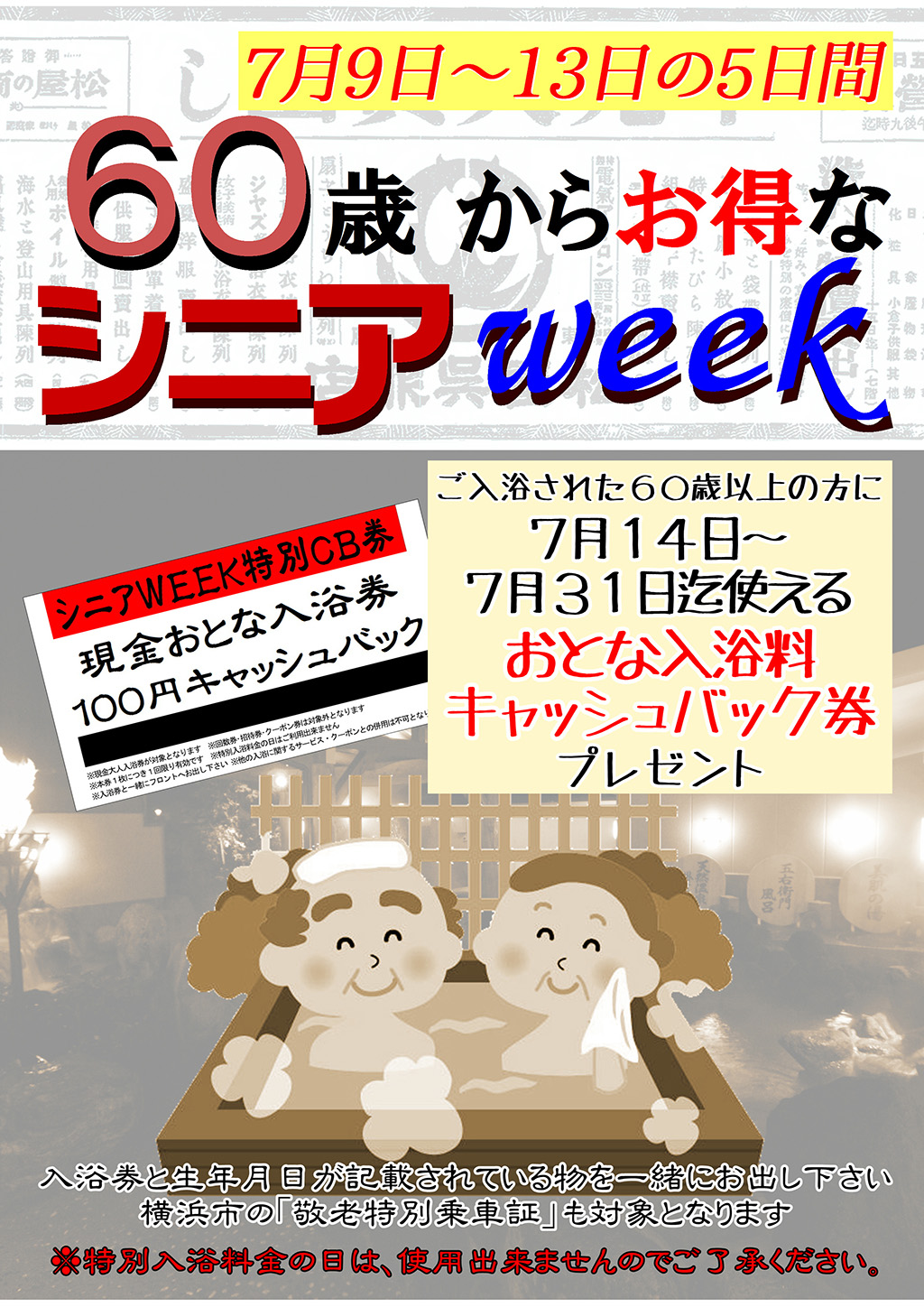 期間中ご入浴の60歳以上のお客様で、入浴券と一緒に年齢を示すものをご提示いただいたお客様に、7/14(土)から7/31(火)まで使える「おとな入浴料キャッシュバック券」を差し上げます。