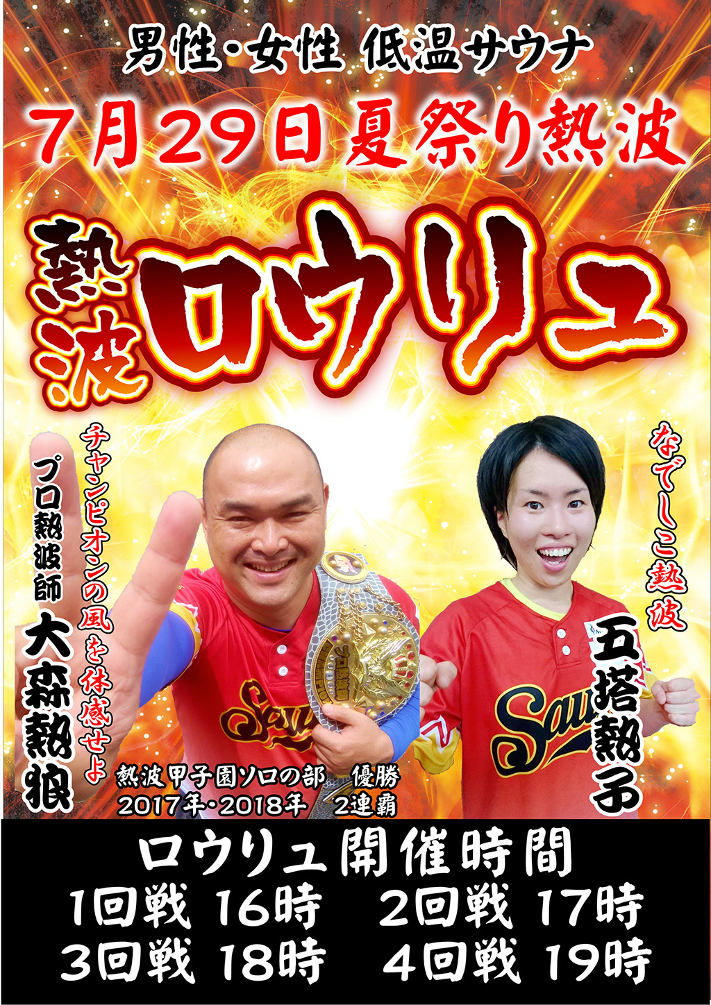 2018年6月29日 / 最終更新日時 : 2018年6月29日 okubo このイベントは終了しました 夏祭り熱波ロウリュ イベント詳細 日付: 2018年7月29日 カテゴリ: このイベントは終了しました 夏祭り熱波ロウリュ 7/29(日) 毎年恒例、7月最後の日曜日はたや温泉の納涼夏祭り。 お店の外では子どもに嬉しい家族で楽しい夏祭り。中では大人の夏祭り! 男女同時開催!7/29(日)16時から4回、「夏祭り熱波ロウリュ」を開催。 納涼?これが熱波のお祭りだ! ~開催時間~ 16時・17時・18時・19時 共有:Tweet