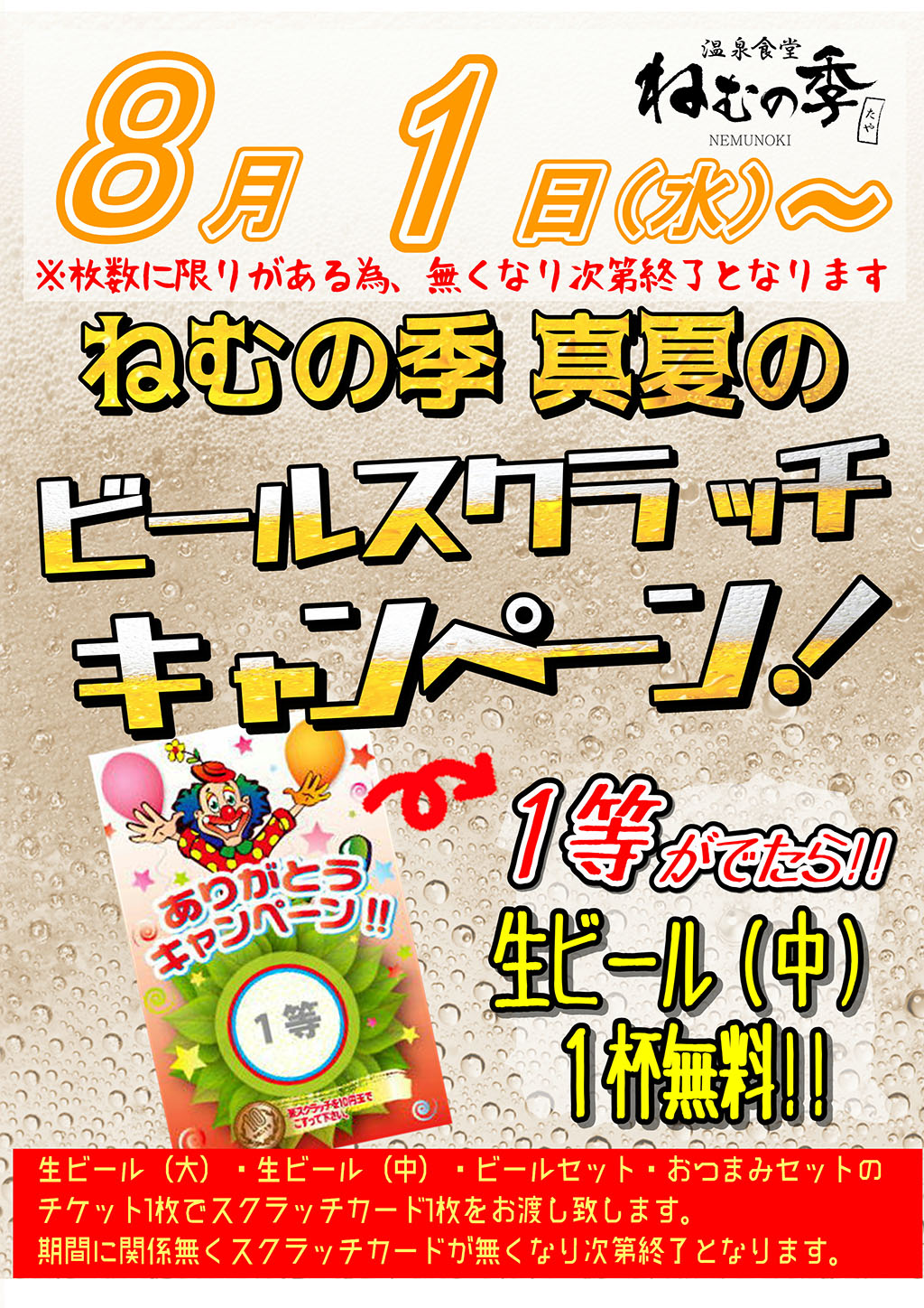 2018年7月31日 / 最終更新日時 : 2018年7月31日 okubo このイベントは終了しました ビールスクラッチ イベント詳細 日付: 2018年8月1 – 25日 カテゴリ: このイベントは終了しました ビールスクラッチキャンペーン 8/1(水)~ 数量限定、なくなり次第終了! 期間中、生ビール(大・中)やビールセット、おつまみセットをご注文ごとにスクラッチカードを1枚差し上げます。 何が出るかは削ってからのお楽しみ。 1等が出れば、生ビール(中)1杯無料サービス! ※期間中でもスクラッチカード配布予定枚数に到達次第終了となります 共有:Tweet