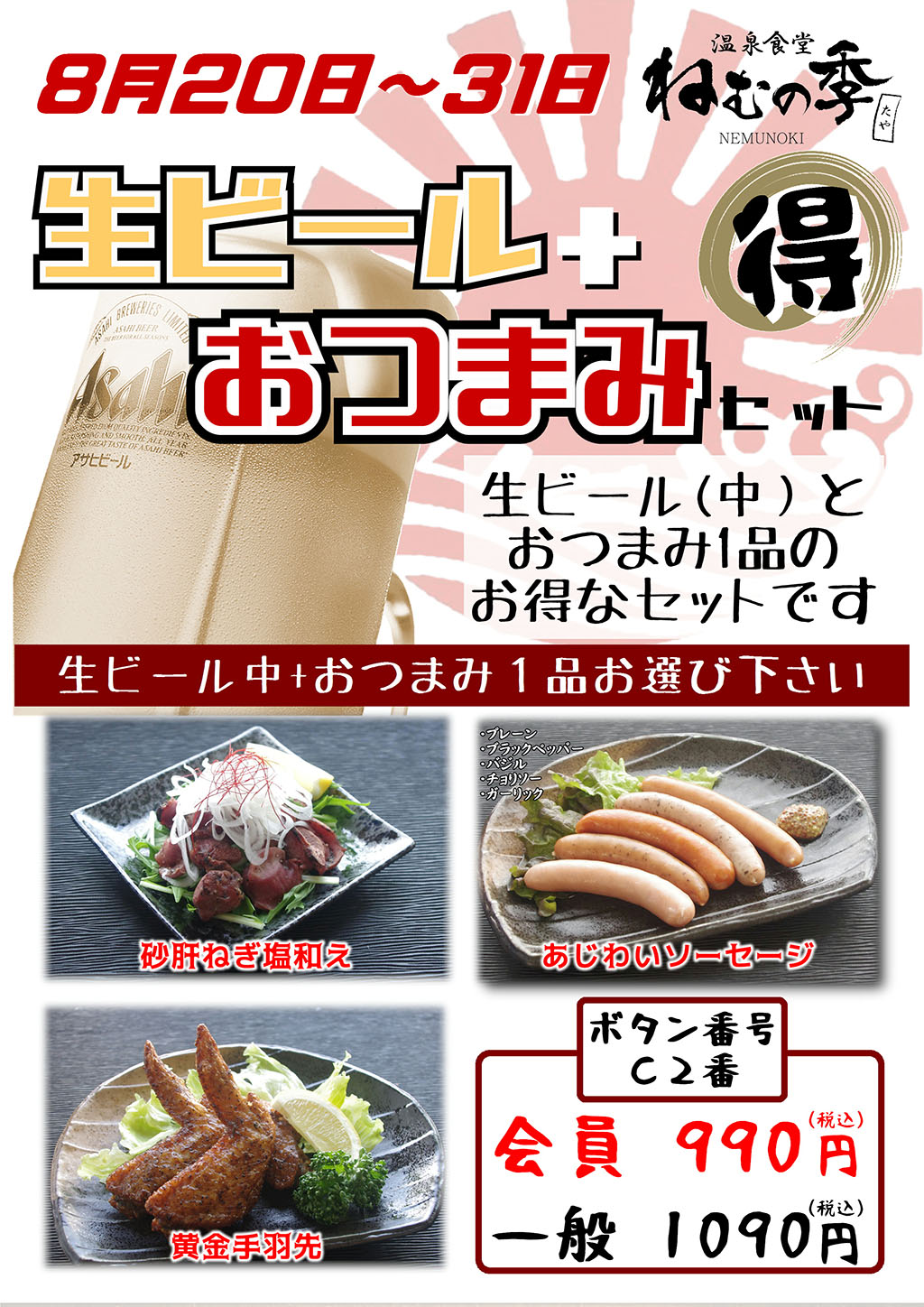 2018年7月31日 / 最終更新日時 : 2018年8月20日 okubo このイベントは終了しました 生ビールおつまみセット イベント詳細 日付: 2018年8月20 – 31日 カテゴリ: このイベントは終了しました 生ビール+おつまみ 得々セット 8/20(月)~8/31(金) 田谷温泉の黒湯や漆黒の炭酸泉(黒湯+医療用炭酸泉)で疲れを癒した後は、風呂上がりに格別の1杯を。 湯快爽快たやのお食事処では、期間限定で生ビールによく合うおつまみのお得なセットをご提供。 この機会にぜひ、湯快爽快で「乾杯!」を。 選べるおつまみ 砂肝ねぎ塩和え あじわいソーセージ 黄金手羽先 生ビール(中)とセットで・・・ 会員 990円 / 一般 1,090円 共有:Tweet