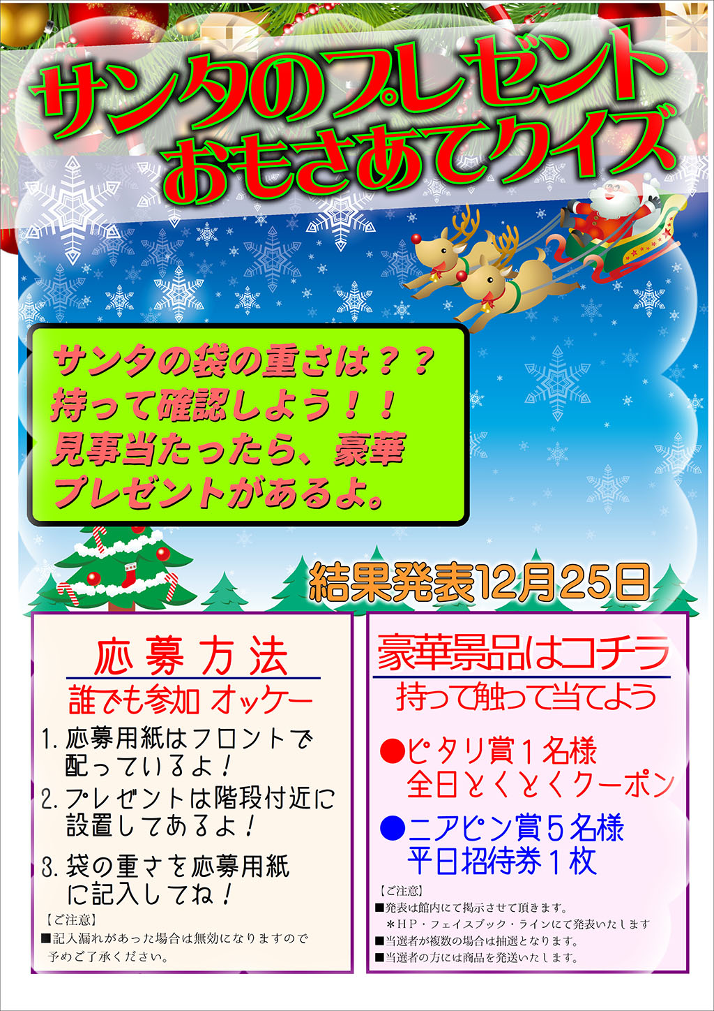 2018年11月29日 / 最終更新日時 : 2018年11月29日 okubo このイベントは終了しました サンタのプレゼント重さ当てクイズ イベント詳細 日付: 2018年12月1 – 24日 カテゴリ: このイベントは終了しました サンタのプレゼント重さ当てクイズ 12/1(土)~12/24(月) MERRY CHRISTMAS! 田谷温泉では12/1~12/24の間、サンタクロースが置いていったプレゼント袋の重さ当てクイズを行います。 どなたでも参加OK。 フロントで応募用紙をもらったら、階段付近の袋を持って触って重さを当てよう! ピタリ賞やニアピン賞の方には豪華景品をプレゼント。 発表は12/25(火)です。 共有:Tweet