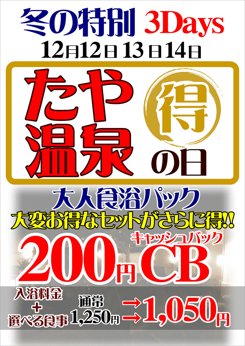 冬の特別3Days たや温泉の日 12/12(水)~12/14(金)