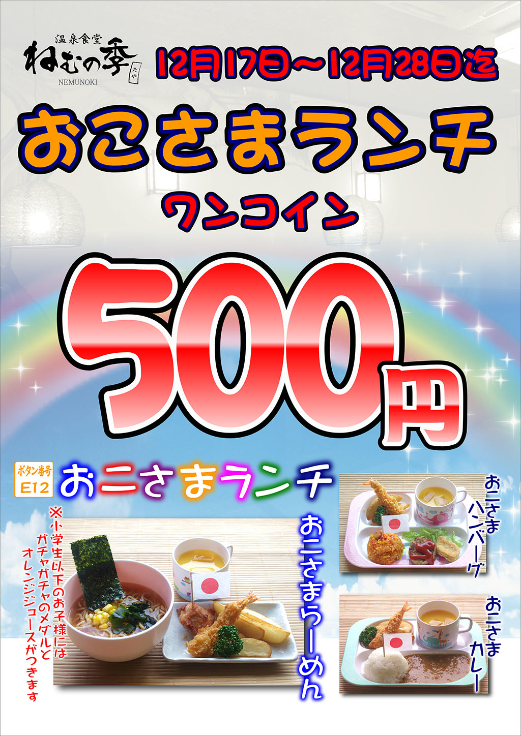 2018年11月29日 / 最終更新日時 : 2018年11月29日 okubo このイベントは終了しました おこさまランチワンコイン イベント詳細 日付: 2018年12月17 – 28日 カテゴリ: このイベントは終了しました おこさまランチ ワンコイン 12/17(月)~12/28(金) 12月は17日から28日までお子様ランチがとってもお得なワンコイン! ラーメン、ハンバーグ、カレーの選べる3種のお子様メニュー、お食事の外にガチャガチャができるメダルやオレンジジュースもついて、期間中はジャスト500円! 田谷温泉、温かいお風呂に限らず、家族みんなで温泉食堂「ねむの季」でもお得にお寛ぎくださいね! 共有:Tweet