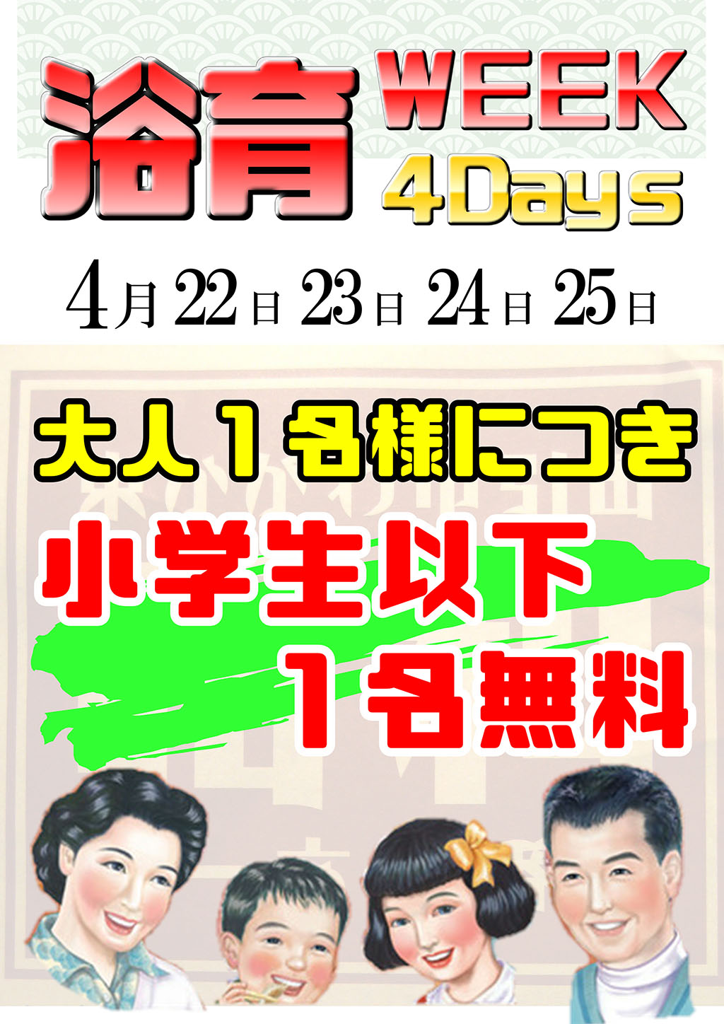 2019年3月28日 / 最終更新日時 : 2019年3月28日 okubo このイベントは終了しました 浴育WEEK 4Days イベント詳細 日付: 2019年4月22 – 25日 カテゴリ: このイベントは終了しました 浴育WEEK 4Days 4/22(月)~4/25(木) 家族みんなで楽しく健やかに♪ ゴールデンウィーク直前の4日間は家族皆様でのご来店がとってもお得! 大人1名様につき同伴のお子さま1名がなんと入浴無料! ご夫婦でのご来店なら2名まで、お爺ちゃんお婆ちゃんもご一緒なら・・・ さあ!平成最後の大型連休を前に、ご家族みんなでお得にお風呂を満喫してリフレッシュ♪ 連休の楽しいお出かけに向けて英気を養いましょう! 共有:Tweet