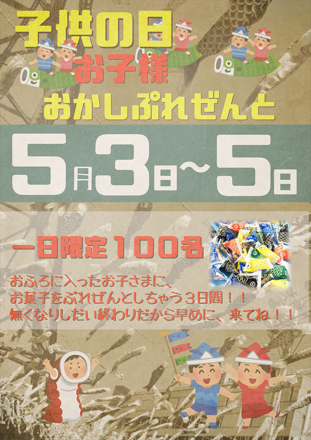 2019年4月26日 / 最終更新日時 : 2019年4月26日 okubo このイベントは終了しました お菓子プレゼント! イベント詳細 日付: 2019年5月3 – 5日 カテゴリ: このイベントは終了しました 子供の日☆おかしぷれぜんと! 5/3(金)~5/5(日) 子どもの成長を家族みんなでお祝いしよう♪ 来ました!『令和』元年の子どもの日☆ こどもの日に家族でお出かけするなら湯快爽快たやで決まりでしょ! 3日間、各日100名様限定、お菓子が無くなり次第終了です。 早めに来てね~!! 共有:Tweet