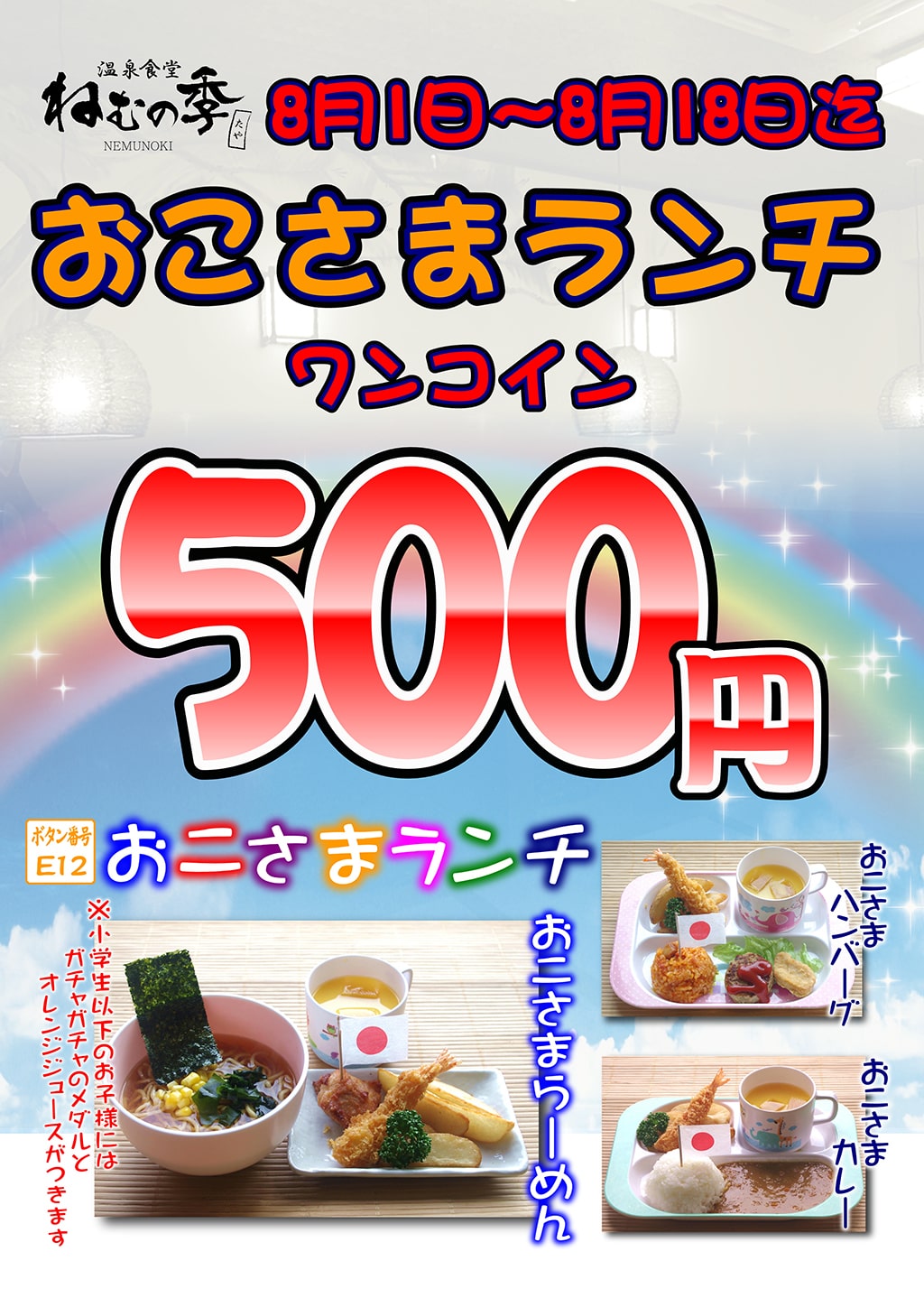 2019年7月30日 / 最終更新日時 : 2019年7月30日 okubo このイベントは終了しました おこさまランチワンコイン イベント詳細 日付: 2019年8月1 – 18日 カテゴリ: このイベントは終了しました おこさまランチ ワンコイン! 8/1(木)~8/18(日) 暑さに負けずに、ご飯もいっぱい食べましょう! ラーメン、ハンバーグ、カレーの選べる3種のお子様メニューが対象。 お食事の外に、ガチャガチャができるメダルやオレンジジュースもついて、ジャスト500円! お風呂だけじゃない、たや温泉の温泉食堂「ねむの季」を親子でお得に美味しく楽しんでくださいね。 共有:Tweet