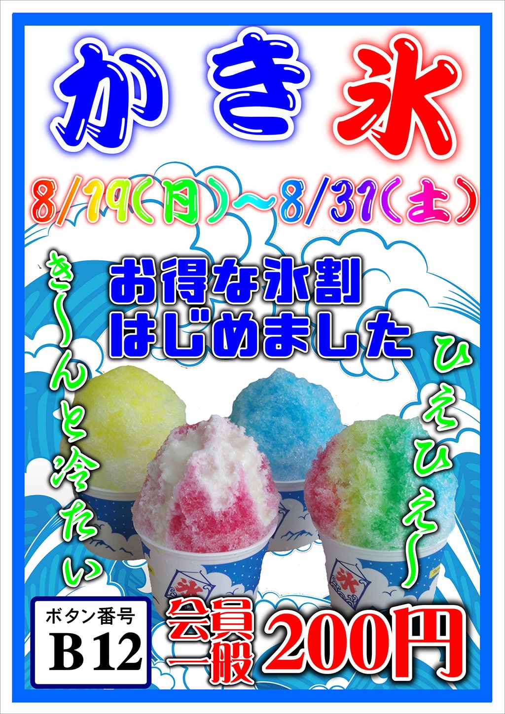 2019年7月30日 / 最終更新日時 : 2019年7月30日 okubo このイベントは終了しました お得な氷割・かき氷 イベント詳細 日付: 2019年8月19 – 31日 カテゴリ: このイベントは終了しました お得な氷割・かき氷 8/19(月)~8/31(土) ひえひえ~? き~んと冷たい!かき氷 お風呂上りのオタノシミ ☺ 暑い夏が到来! 8月19日から、かき氷1杯 200円 (通常:会員260円/一般310円) お風呂で汗を流した後は、かき氷でクールダウンしてくださいね♪夏も元気いっぱいで過ごしましょう~? 共有:Tweet